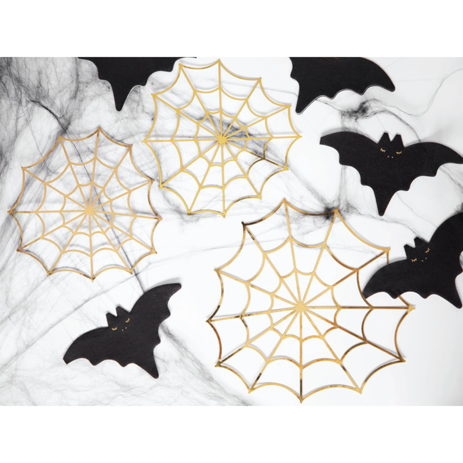 Decorate with an iconic Halloween look with these Gold Spiderweb Paper Decorations. These die-cut spiderwebs feature a gold mirrored finish in three sizes. Perfect for parties or spooky seasonal displays, the web-like shapes are crafted from lightweight paper with a sparkling gold foil finish. Hang these decorations on a wall or scatter them around your spooky tablescape. These gold mirrored spiderwebs make them versatile for a spooky Halloween birthday party.