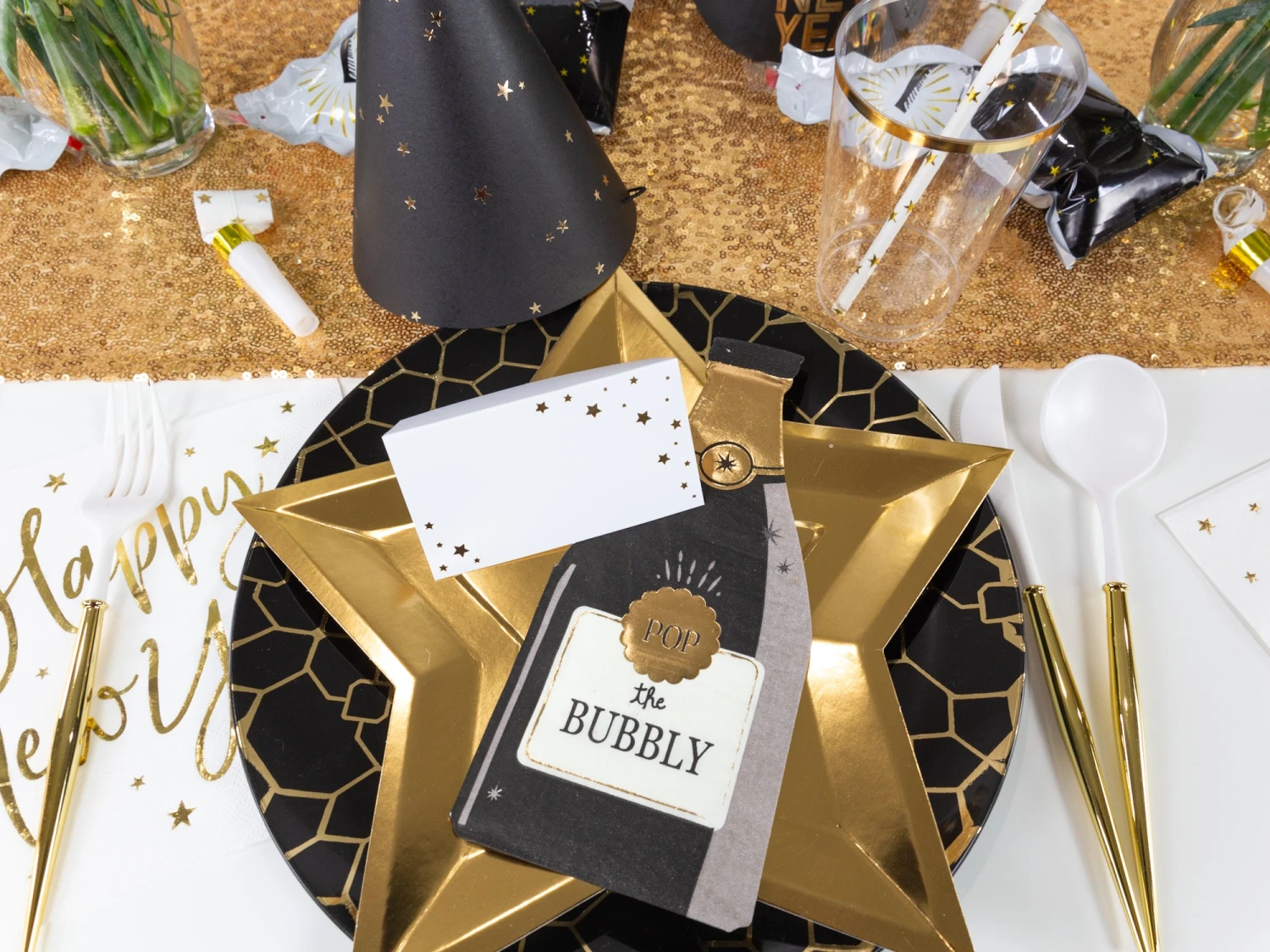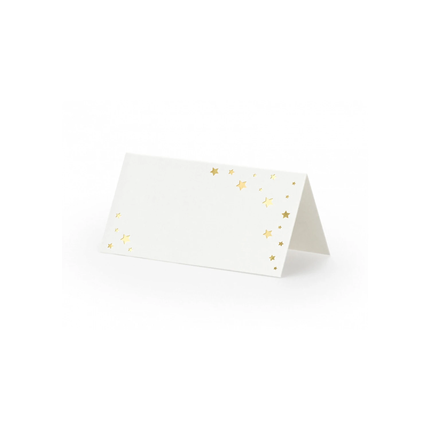 Decorate the tables at your baby shower with Gold Stars Place Cards! Add a twinkle to your decorations and keep seating arrangements organized with these blank place cards. The cardstock place cards are white and have small gold stars on the corners. These tent-style place cards can be used to seat guests or to label food or beverage stations at a child’s space birthday party or a twinkle twinkle first birthday party. These blank place cards are a stylish way to direct guests to your New Year’s Eve celebration!