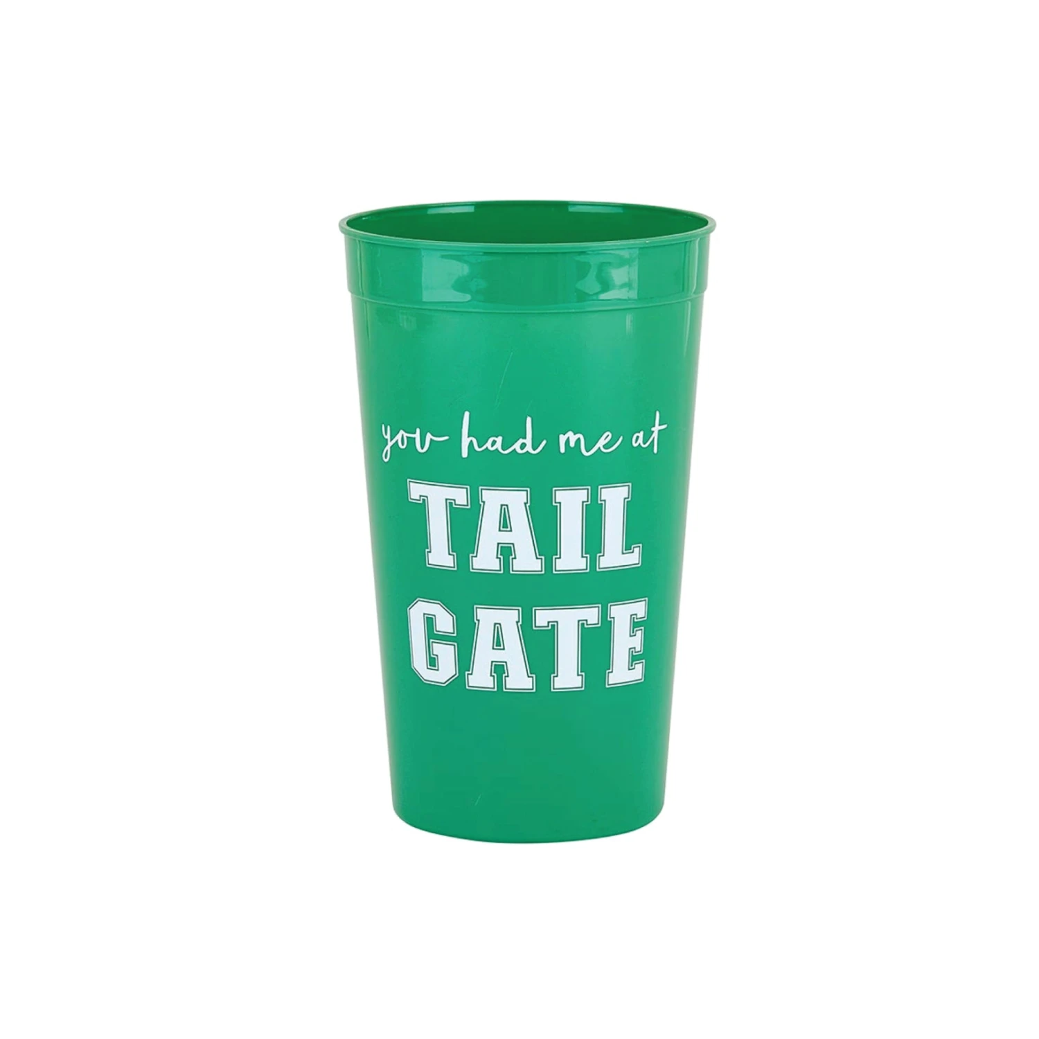 Enjoy a tall and refreshing beverage at your next game in these Green You Had Me at Tailgate Plastic Cups. These green stadium-sized plastic cups feature the headline “You Had Me at Tailgate” in white script. Use football cups to serve soda, punch, and other refreshing drinks at your football-themed birthday party. Pair these cups with other football tableware and decorations for a fun tailgate baby shower or super bowl watch party. Enjoy a sip of your favorite drink or send them home with guests as fun party favors!