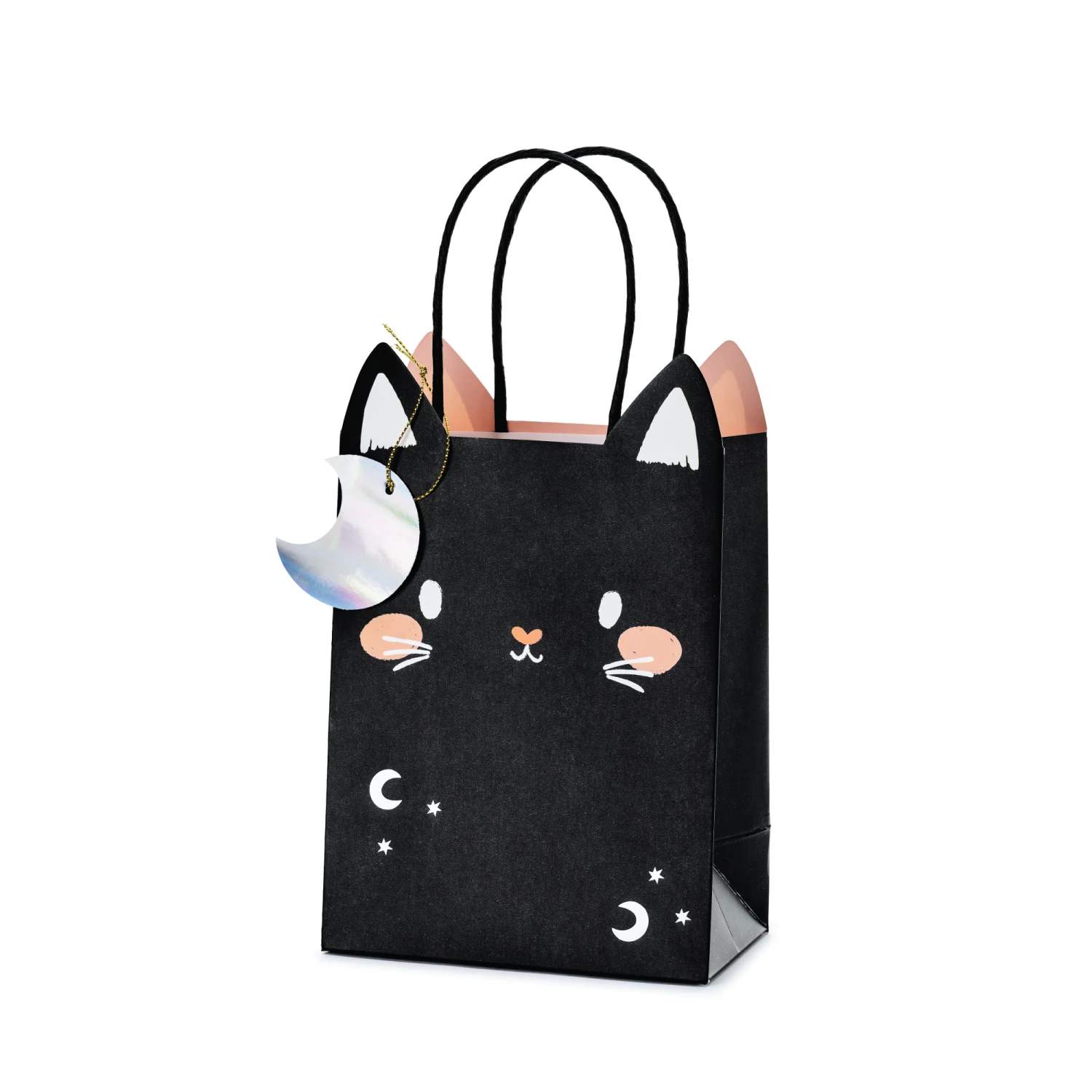 Hand out the purr-fect party favors and treats in these Halloween Cat Favor Bags. These paper treat bags feature a cute cat face with white and pale orange features, silver foil details on a black background, black handles, and a silver foil circle hanging tag. Use these goodie bags to fill with candy or themed favors from your Halloween birthday party or hand them out to trick-or-treaters on Halloween night.