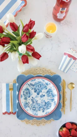 Make your summer celebration stand out with these Hamptons Blue Scalloped Dinner Plates! These large paper plates are inspired by chambray and feature a scalloped border that adds a fun, stylish touch to any meal. Whether you’re hosting a 4th of July party, a July birthday bash, or a patriotic party by the pool, these blue plates are the perfect pick for serving up your favorite dishes. Pair them with coordinating red, white, and blue party supplies for a festive and eye-catching place setting your guests will love.