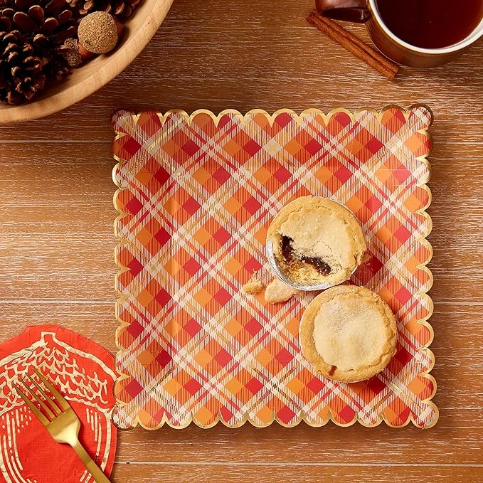 Serve your Thanksgiving turkey and mashed potatoes on these Harvest Plaid Scalloped Square Lunch Plates. These gorgeous large square paper plates feature an orange, red, cream, and gold foil plaid pattern with a scalloped gold foil edge. The plates are large enough to hold plenty of food at your Friendsgiving & Thanksgiving dinner. Place these Thanksgiving plates on your fall tablescape so guests can enjoy your Thanksgiving Day feast, and cleanup will be a breeze.Â