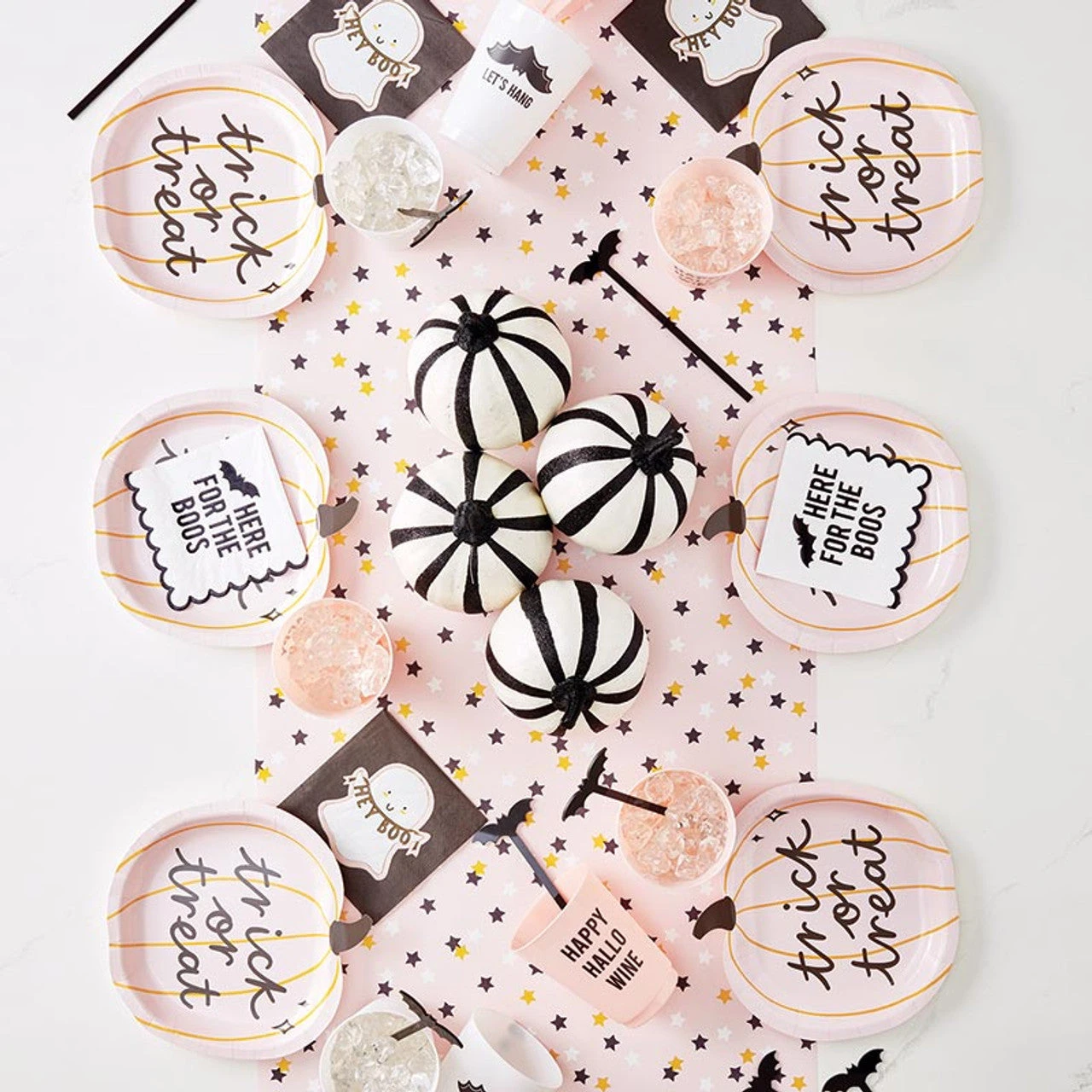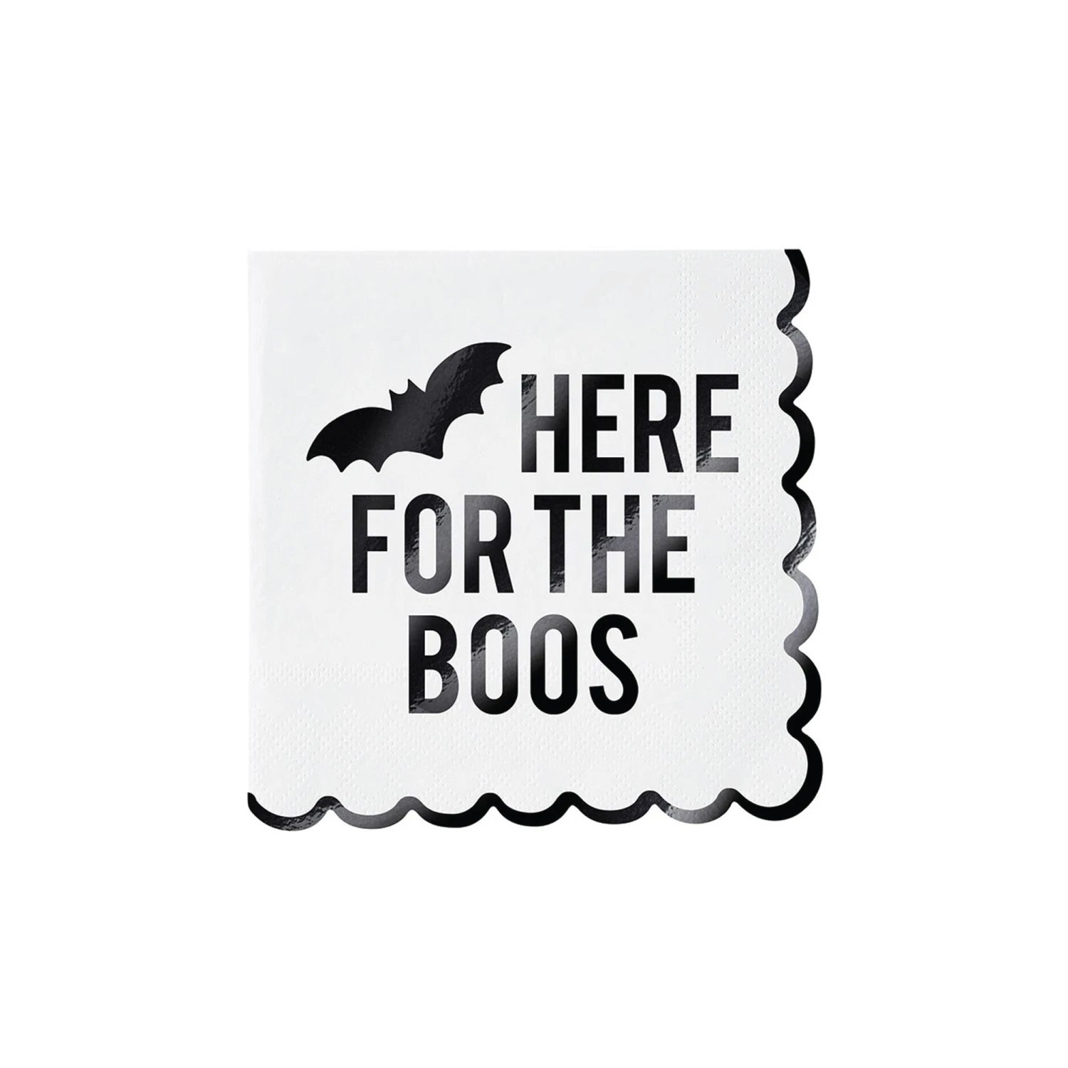 Give your boo-tiful bites a spooky style with these “Here For The Boos” Scalloped Dessert Napkins! These small paper napkins feature a white background with a scalloped edge trimmed in black and a bold “here for the boos” headline alongside a black bat. Perfect for catching spills and crumbs, these napkins are ready to add a playful touch to your Halloween party. Let your guests enjoy their sweet treats without worry because these Halloween napkins are here for the boos (and the mess)!