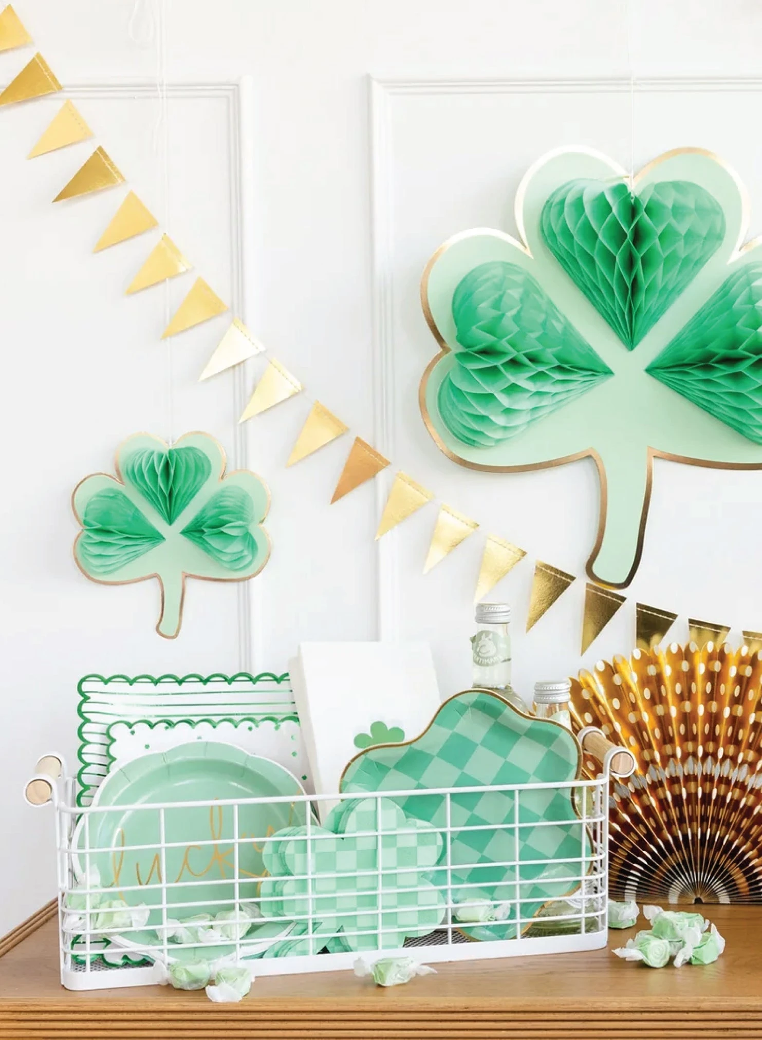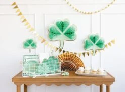 Add a burst of lucky charm to your St. Patrick’s Day party with these Honeycomb Shamrocks Hanging Decorations. These honeycomb decorations feature pastel green tissue paper shamrocks and sturdy green cardboard backings with gold foil trim. Unfold each shamrock and secure it with the included adhesive closures, creating a delightful three-dimensional effect that catches the eye. Hang these shamrocks on the walls, create a stunning backdrop for photo ops, or use them as a focal point for your St. Patty’s Day decorations. Whether hosting a St. Paddy’s Day extravaganza filled with Irish cheer or a lucky one’s first birthday party wishing for good fortune, these honeycomb decorations ensure your celebration is dazzling and memorable!
