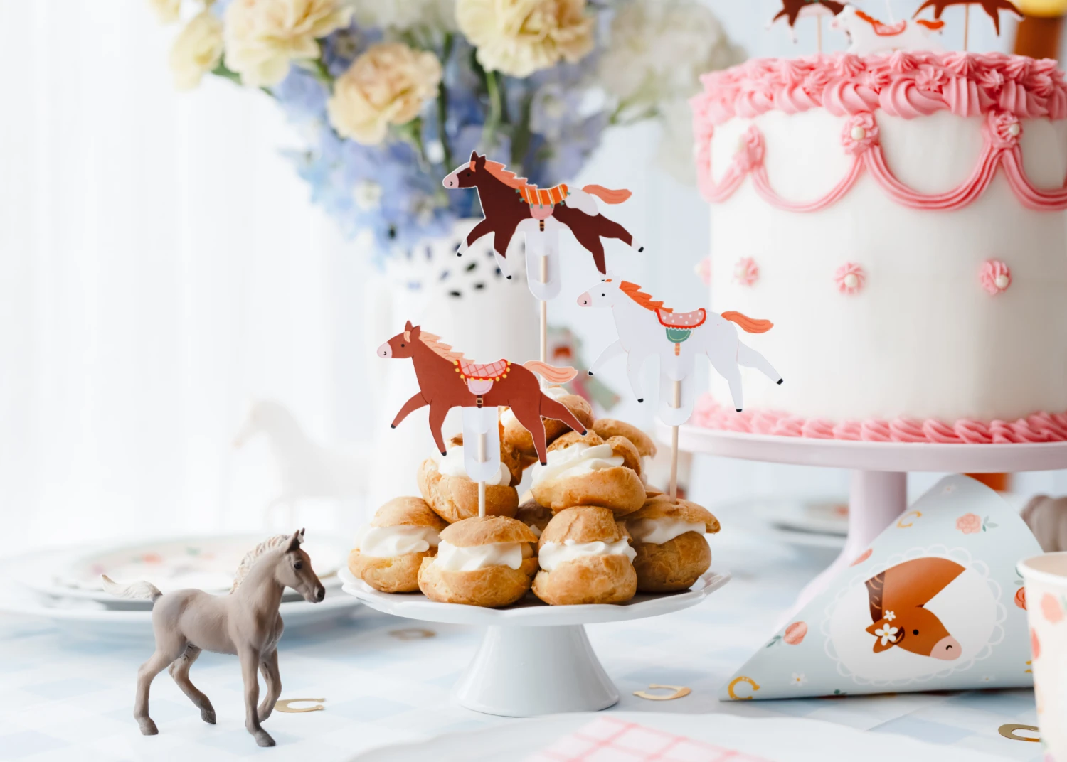 Gallop into cake decorating fun with Horse Cake Toppers! This pack of six cake toppers features sturdy wooden picks and paper cutouts of brown, white, and quarter-horses, each with a pre-cut slot for easy assembly. Slip the horses onto the wooden sticks to decorate a birthday cake, donuts, or any sweet treat with equestrian flair. Whether you’re hosting an “Off Two the Races” horse birthday party, a Kentucky Derby party, or any saddle-up celebration for your little pony enthusiast, these horse toppers will gallop straight into everyone’s hearts.