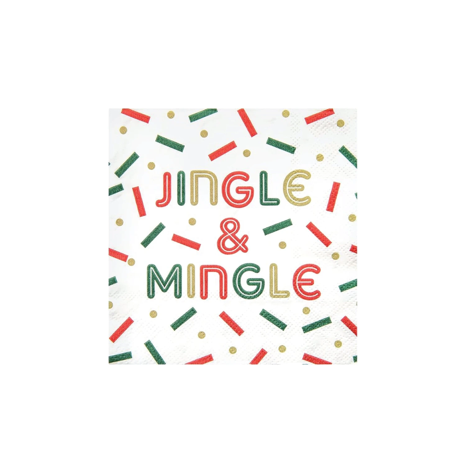 Spice up your holiday Christmas party with these Jingle & Mingle Dessert Napkins! These small paper napkins feature confetti in red and green, gold dots, and “jingle & mingle” written in red, green, and gold script on a white background. Set a stack of these beverage napkins on the dessert table so guests can grab some with their drinks and snacks. With a pack of 20, you’ll have enough for all your guests to mingle and enjoy their jingle!