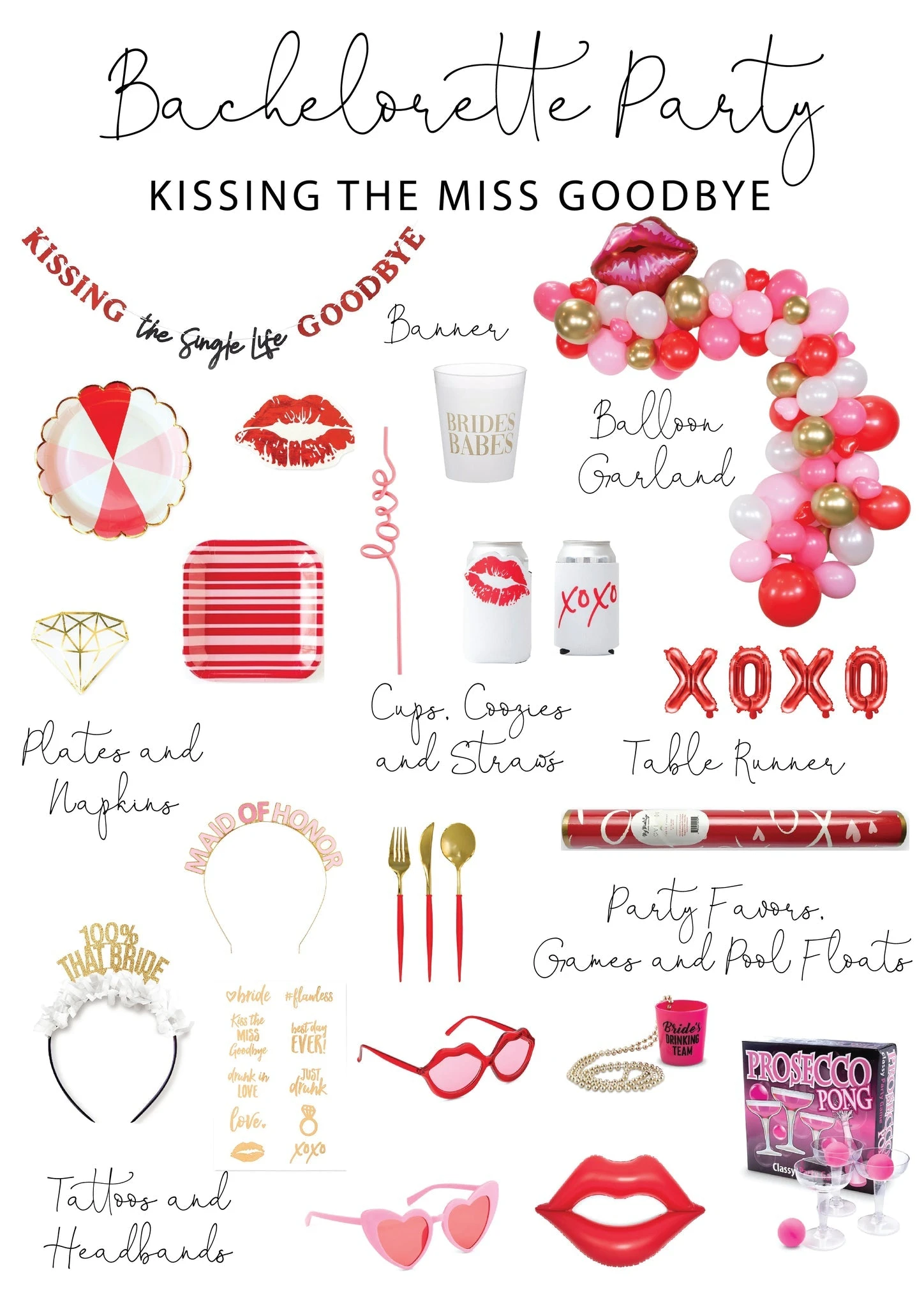 Plan a last fling before the ring with a Kissing The Single Life Goodbye Banner. This paper banner features red and black word pennants that read “Kissing the Single Life Goodbye.” Pre-strung on ribbon for easy display, hang this garland on the wall above the dessert table, across doorways, on the mantle, or along table edges. Or display this garland in your photobooth backdrop so you can take pictures with the bride-to-be at her bachelorette party.
