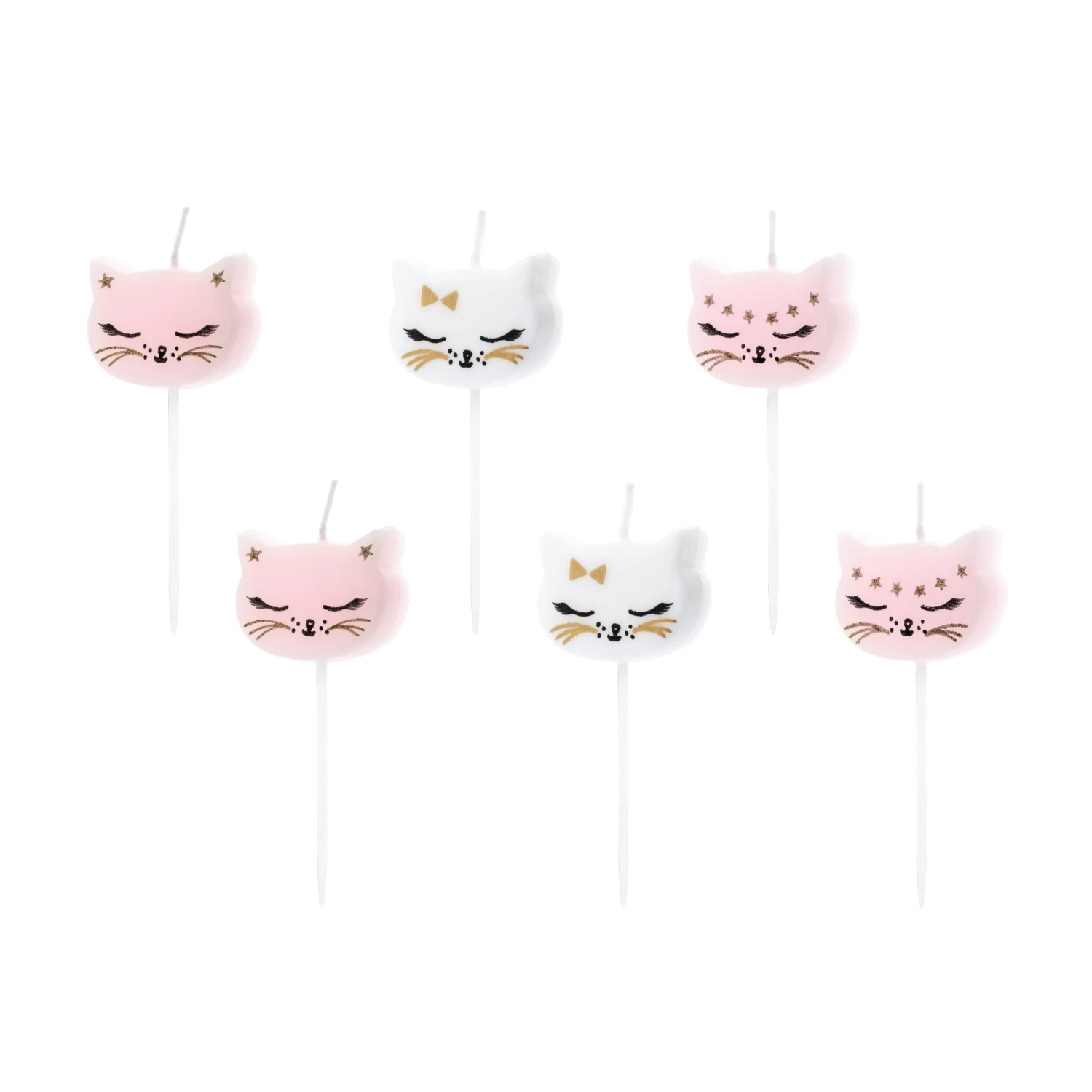 Add the purr-fect topper to your cake with these adorable Kitty Cat Birthday Candles. These wax candles with a cat-shaped face and gold details come in an assortment of pink and white cats. Your little guests will be excited when you bring out the cake with these cat candles!