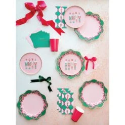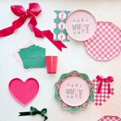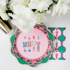 Bring the charm of the Nutcracker to your holiday gatherings with these Lattice & Pink Christmas Nutcrackers Paper Guest Towels, the perfect complement to your Nutcracker party decor. These large paper napkins feature a pink background adorned with a dark green lattice pattern, embellished with pink bows and three nutcrackers marching down the center. Perfect for adding a festive touch to your Christmas party table or powder room, these Christmas napkins are ideal for drying hands and ensuring your guests feel welcomed and merry.