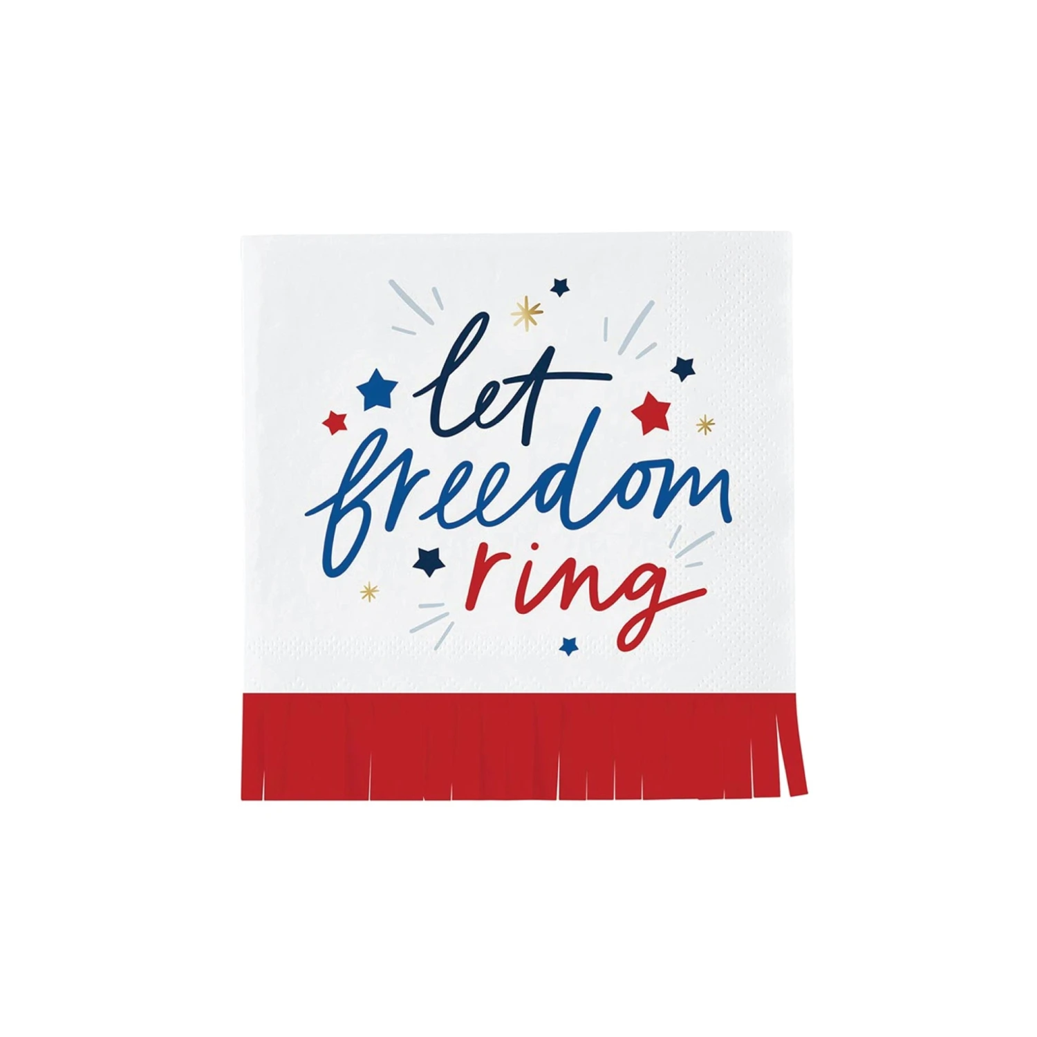 Add some playful patriotism to your next party with our Let Freedom Ring Fringe Dessert Napkins! These small paper napkins feature the headline “Let Freedom Ring” in blue and red script with patriotic stars and bursts on a white background with red fringe. Keep a stack of these patriotic napkins on the table so guests can clean up small spills or use them as a drink coaster at your USA party celebration! Pair these napkins with other red, white, and blue tableware to light up your 4th of July summer BBQ. Whether you are celebrating Memorial Day, Labor Day, or hosting an Olympics watch party, these USA napkins are a festive addition to your party! Pair these napkins with our other patriotic party supplies.