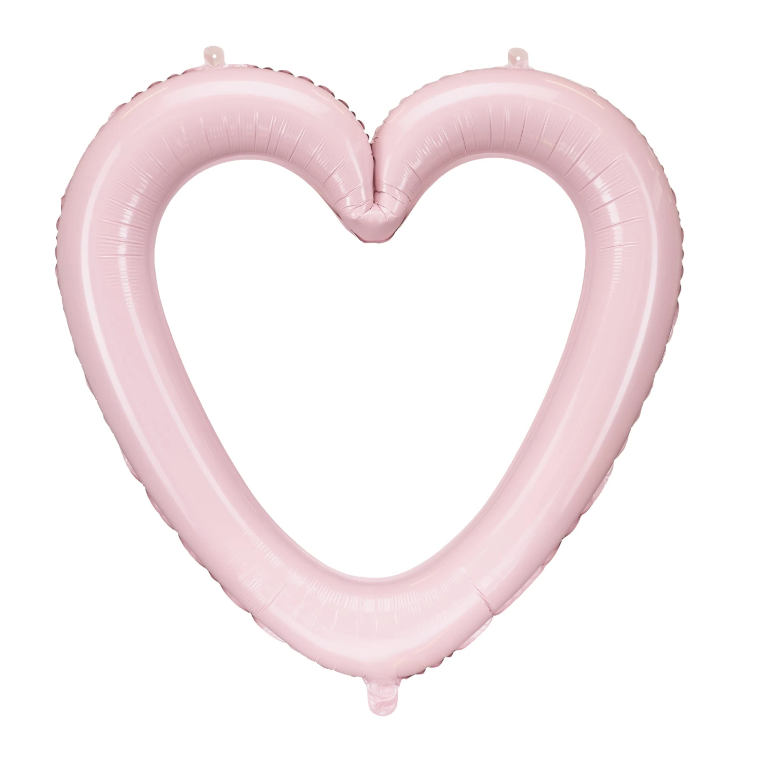Your party guests can strike a pose with this Light Pink Open Heart Balloon Frame. This giant foil balloon is light pink and designed to look like a heart with a hollow center. Use the included straw to inflate with air to hang in a balloon garland, use a photo booth prop, or inflate the heart balloon with helium to have in a balloon bouquet centerpiece. This heart balloon is the perfect decoration to add a loving touch to bridal showers, baby showers, Valentine’s Day, bachelorette parties, first birthdays, and more!Â
