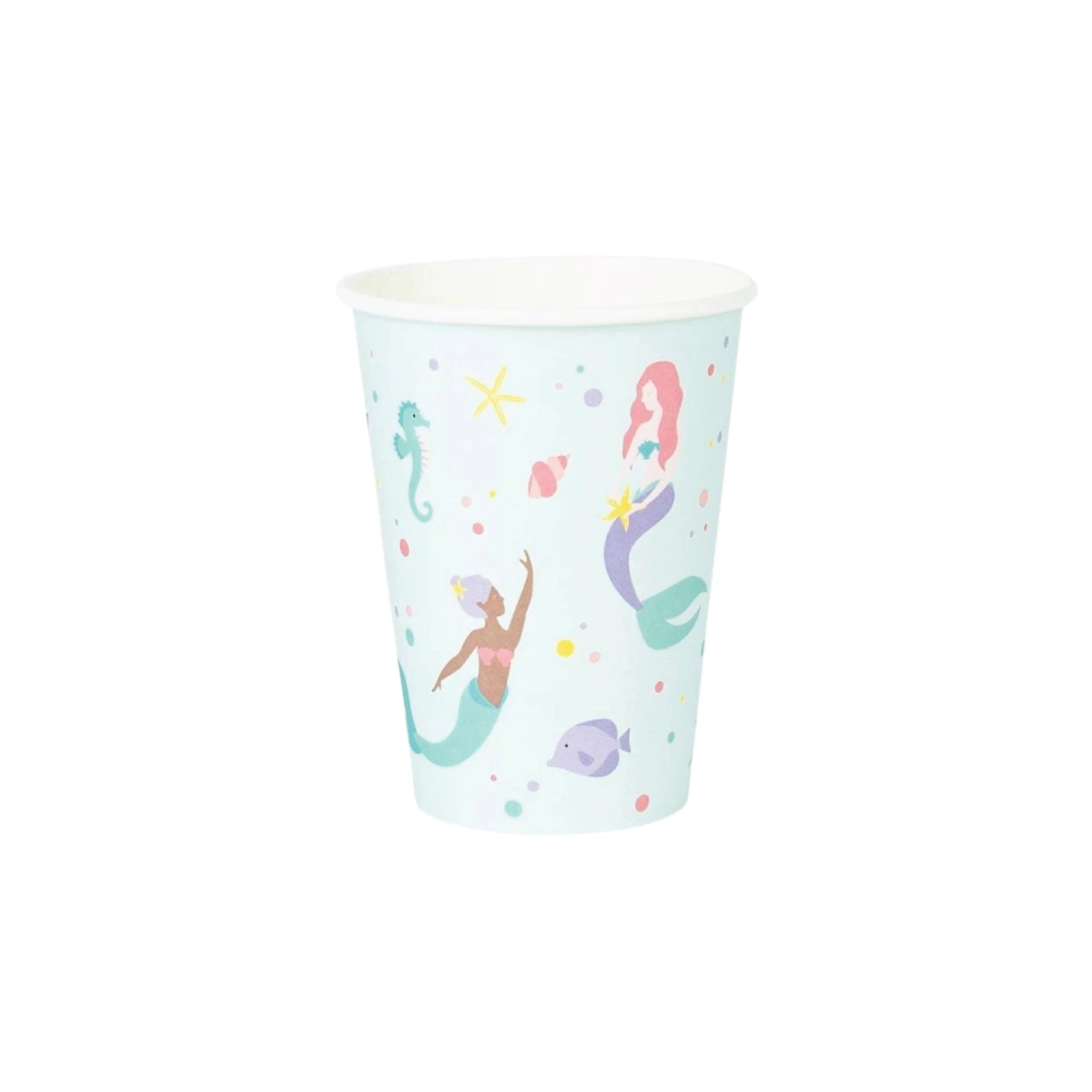 Make your little mermaid’s birthday a splashing success with these Magical Mermaid Paper Cups! These paper cups feature under-the-sea illustrations of pastel seahorses, shells, King Triton, and mermaids against a light blue background. Crafted from FSC paper and dyed with vegetable ink, these eco-friendly cups transport your little mermaids into a world of fantasy and add a sustainable touch to a mermaid birthday party. Ideal for serving refreshing beverages or holding tasty treats, these cups ensure every sip or bite is enjoyed amidst the magical ambiance of the underwater kingdom.