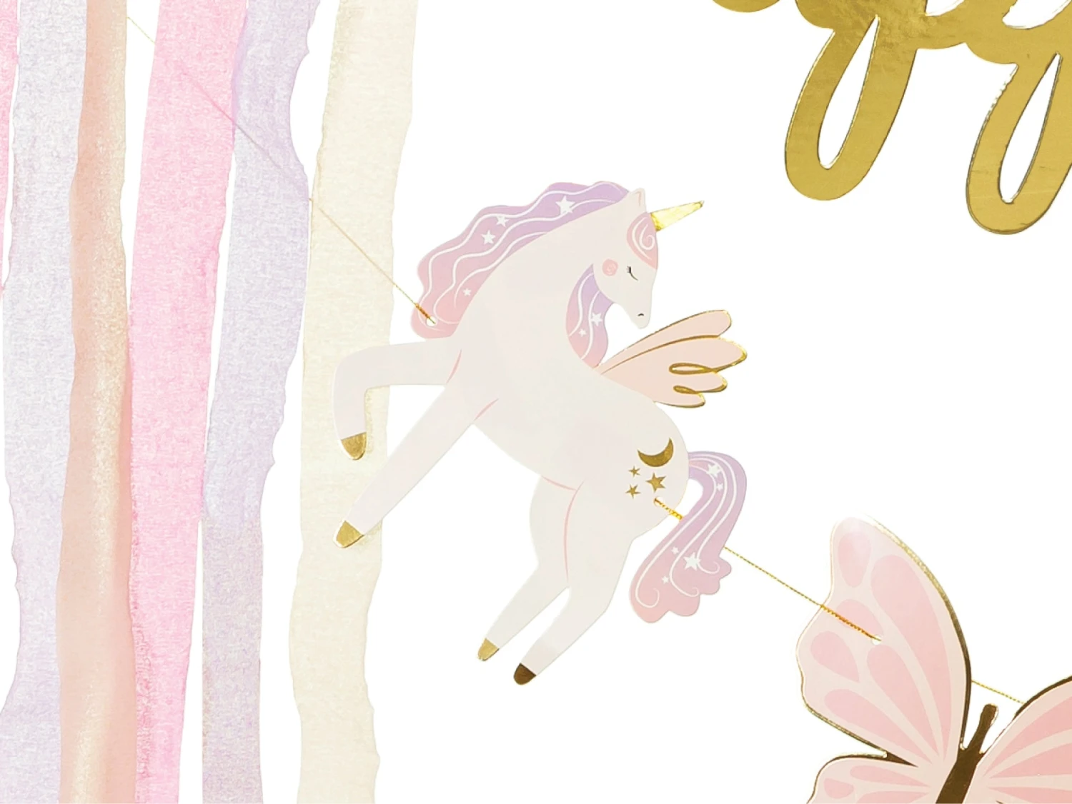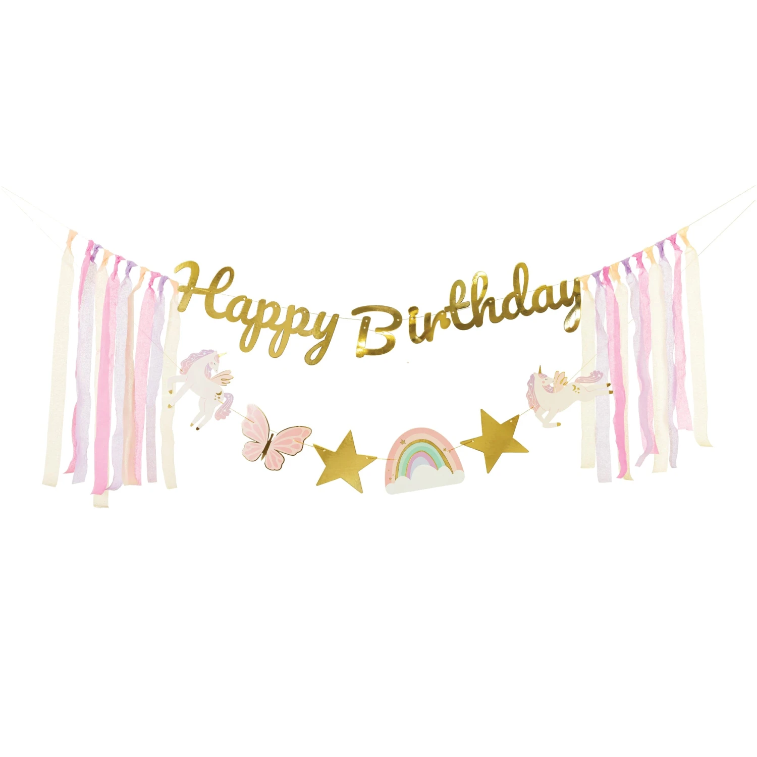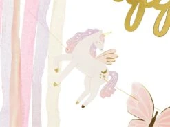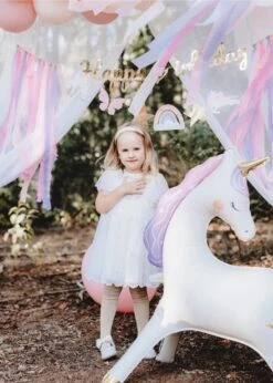 Make your little one’s unicorn birthday extra enchanting with this Magical Unicorn Happy Birthday Banner! This DIY banner kit includes a shimmering gold foil “Happy Birthday” cursive cutout, along with two unicorns, two gold stars, a pink butterfly, and a rainbow paper cutout to create a whimsical display. Delicate pink, purple, and cream crepe paper streamers add a fluttery, dreamy touch. Perfect for unicorn, rainbow, or princess parties, this banner is easy to assemble on the included gold string for a magical backdrop. Hang it above the cake table, in a photo booth area, or as part of a balloon garland to bring sparkle and wonder to any birthday celebration!