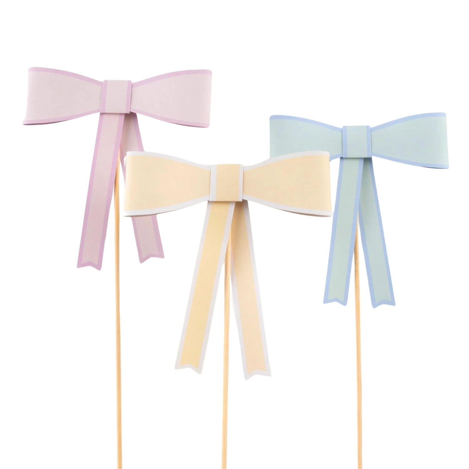 Add the perfect bow-tiful finishing touch to your cake with these Pastel Bow Cake Toppers! These cake toppers feature three charming 3D paper bows in soft mint, peach, and yellow pastel hues, each attached to natural bamboo skewers for easy placement. The yellow bow is shorter, adding an extra layer of dimension. Easily insert these cake decorations into your cake, desserts, or savory food, creating an adorable centerpiece display. Whether it’s a baby shower, first birthday, or a spring gathering, celebrate your special moments with a bow on top, making your desserts as stylish as they are delicious. So, tie your celebration together with these adorable and trendy bow decorations!