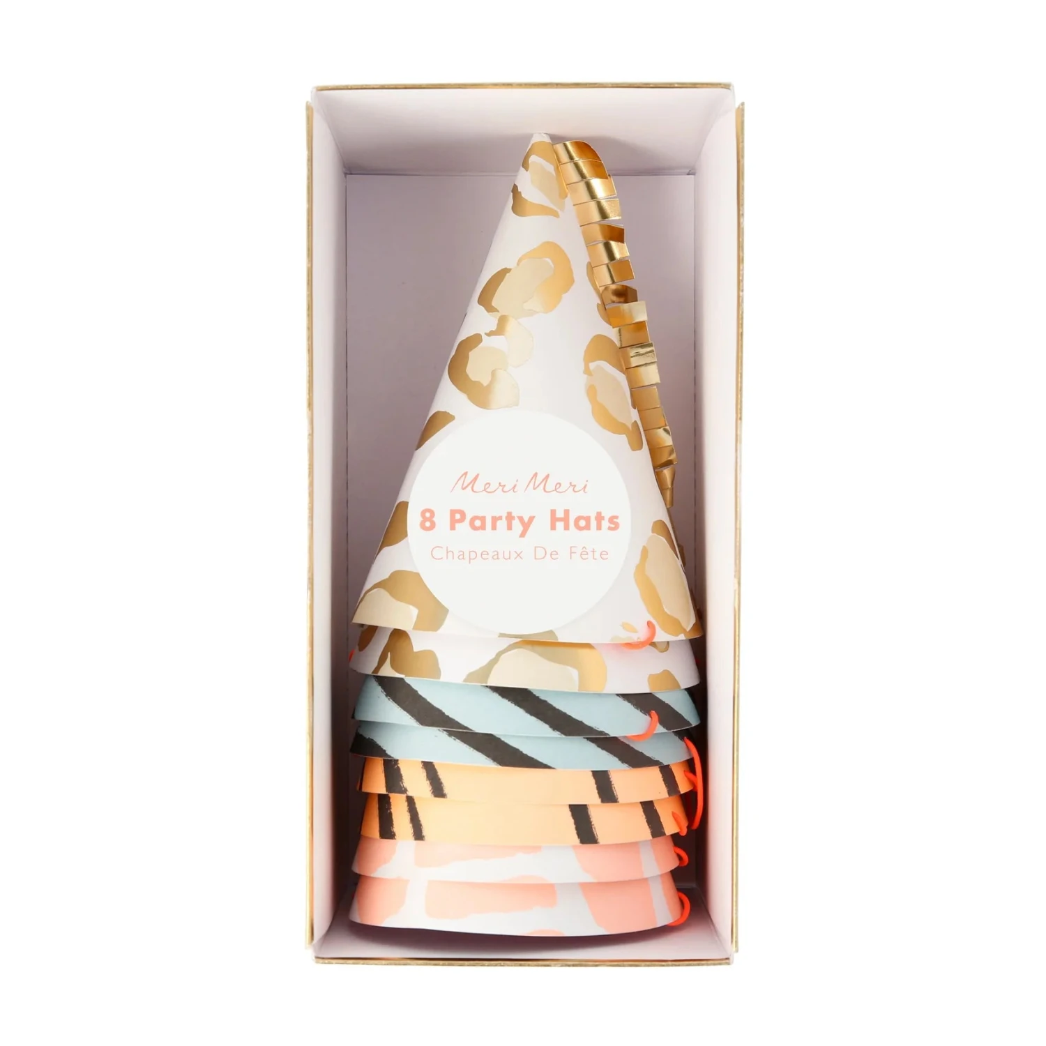 Unleash the party animals with Safari Animal Print Party Hats, the ultimate safari party accessory for a roaring good time! These paper cone hats feature four animal print designs, showcasing the bold stripes of a tiger, the chic elegance of a zebra, the speedy spots of a cheetah, and the towering beauty of a giraffe, all with a gold foil fringe along the side. With a neon orange elastic attached, these safari hats are a breeze to secure on heads or hang on the back of chairs, making them the mane attraction at your safari birthday party.