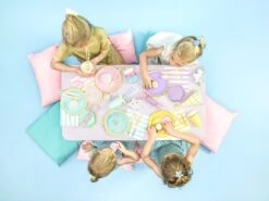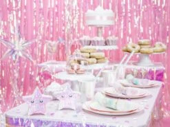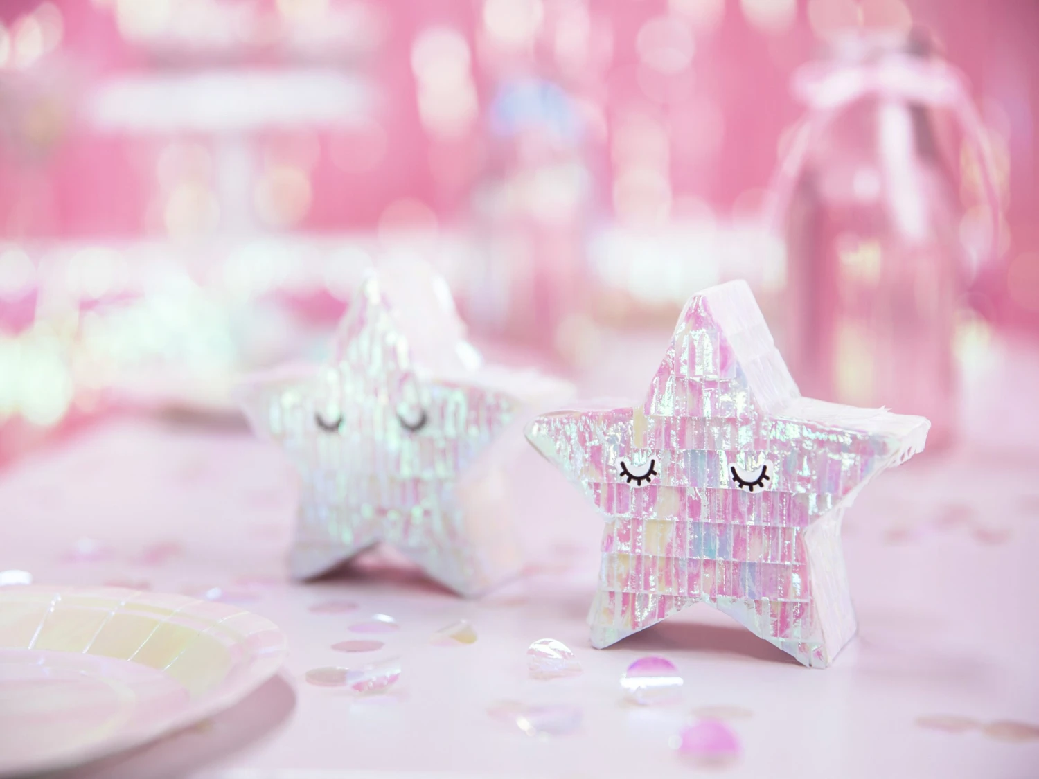 Add some sparkle to your birthday party table decor with this fun Mini Iridescent Star Piñata Party Favor. This mini-sized piñata is covered in iridescent tissue paper fringe with a clear string for hanging. Wow, your guests with this fun star piñata party favor filled with candy or small treats, or use as party decorations for a Unicorn or Star party theme or favors at a Little Star baby shower.