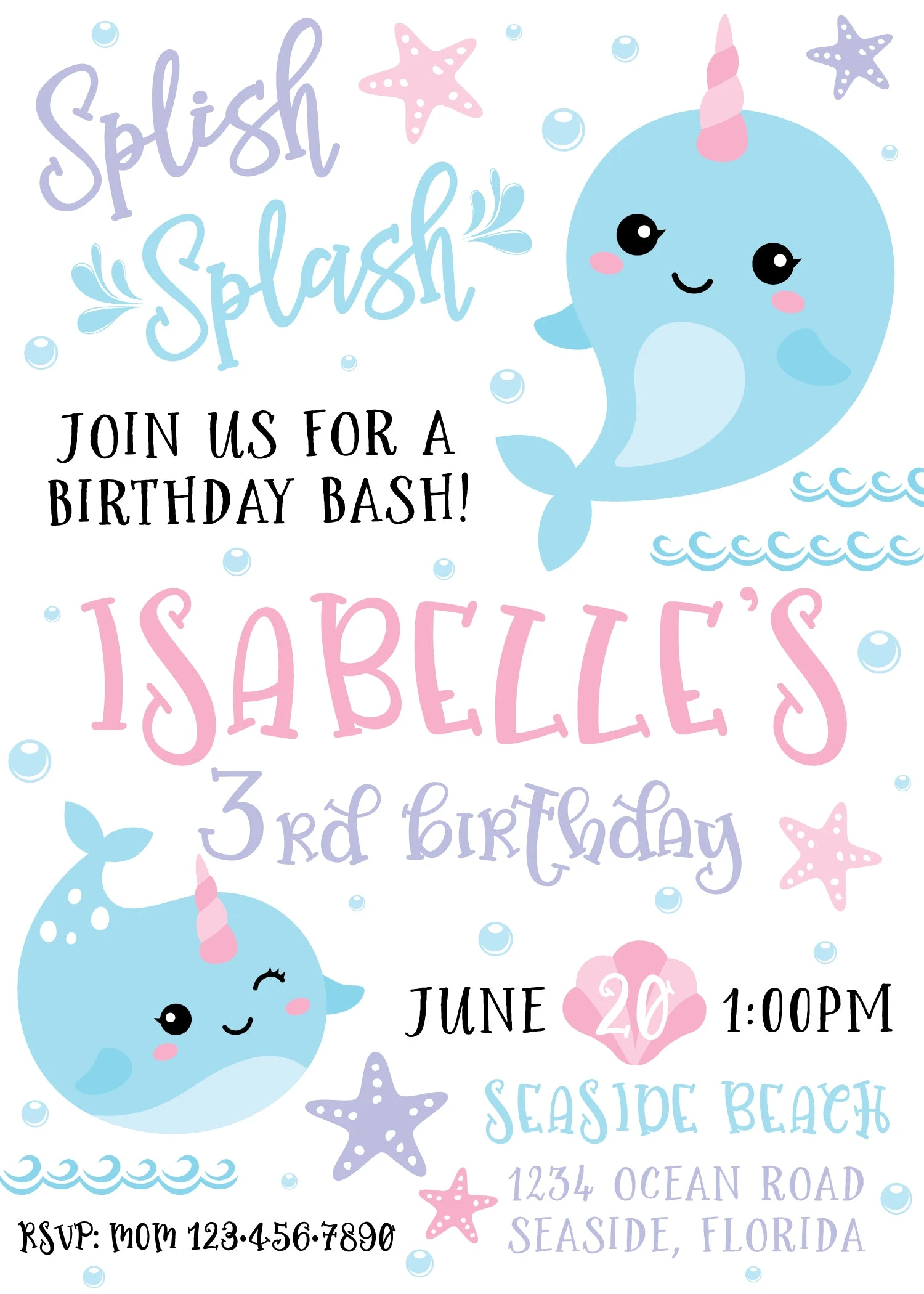 Invite family and friends over for a magical celebration with a printable Narwhal Birthday Invitation! This two-sided digital invitation features adorable blue narwhals with pink horns surrounded by pink and purple starfish, and blue waves and bubbles. The headline “Splish Splash Join us for a Birthday Bash” is written across the top, and the birthday girl’s name is written across the middle in a fun font. The back of the invitation has a printed blue wave pattern with a pink and purple starfish in one corner. Print this digital invitation and invite guests to your child’s narwhal birthday party!