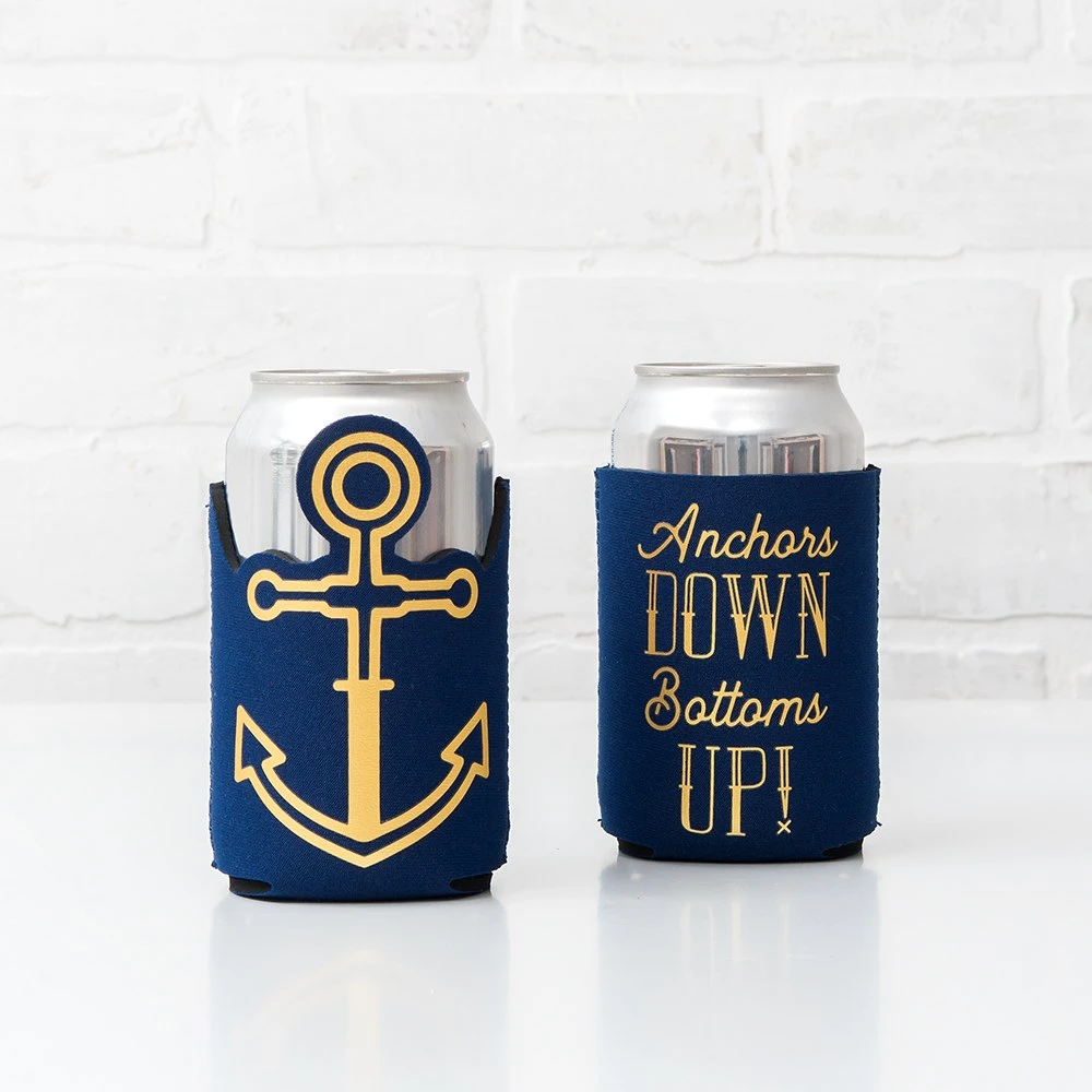 Your drinks will be ice cold and in ship-shape with this Nautical Anchors Down Bottoms Up Can Cooziee. This can cooler is navy with a gold anchor on one side and a headline that reads “Anchors Down Bottoms Ups” on the other side. Use this drink holder to ensure your beer or soda cans and bottles stay cool during your nautical bachelorette party. Give this coozie as a bridesmaid party favor or engagement party gift so they can enjoy it at the lake.
