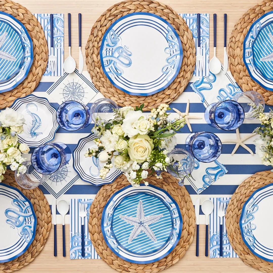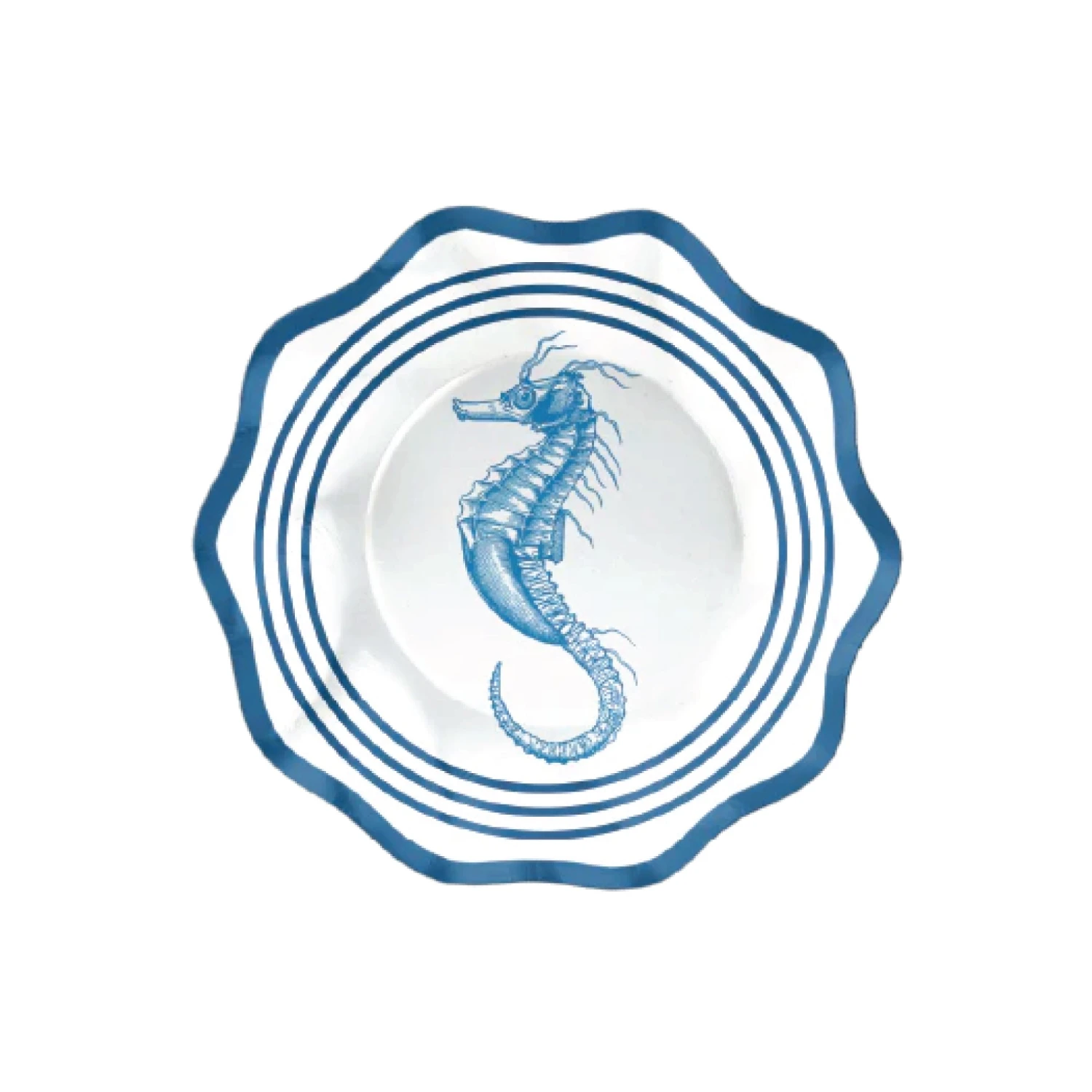 Guests will be ready to sail into a great time when you serve tasty sweets on these Nautical Seahorse Wavy Dessert Bowls! These small paper plates feature an intricately drawn seahorse in the center on a white background with blue and white stripes around the edge. In addition, each plate has a ruffled blue trim that adds grace to a nautical baby shower or bridal shower. Serve savory desserts on these disposable paper bowls, then toss them when you’re done for easy cleanup. Use these delightful nautical plates for celebrating the summer holidays, birthdays, or the mom-to-be.