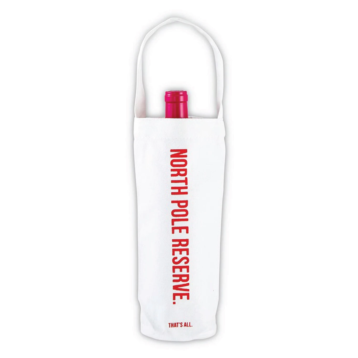 Give your friends the perfect host gift in this North Pole Reserve Canvas Wine Bottle Bag. This canvas wine bag features the headline “North Pole Reserve” in red on a white background with a handle for easy carrying. Give an intoxicating gift for the hostess, a friend’s birthday, or to say thank you. Put a bottle of bubbly or wine in this gift bag for a quick and easy gift that’s sure to please.