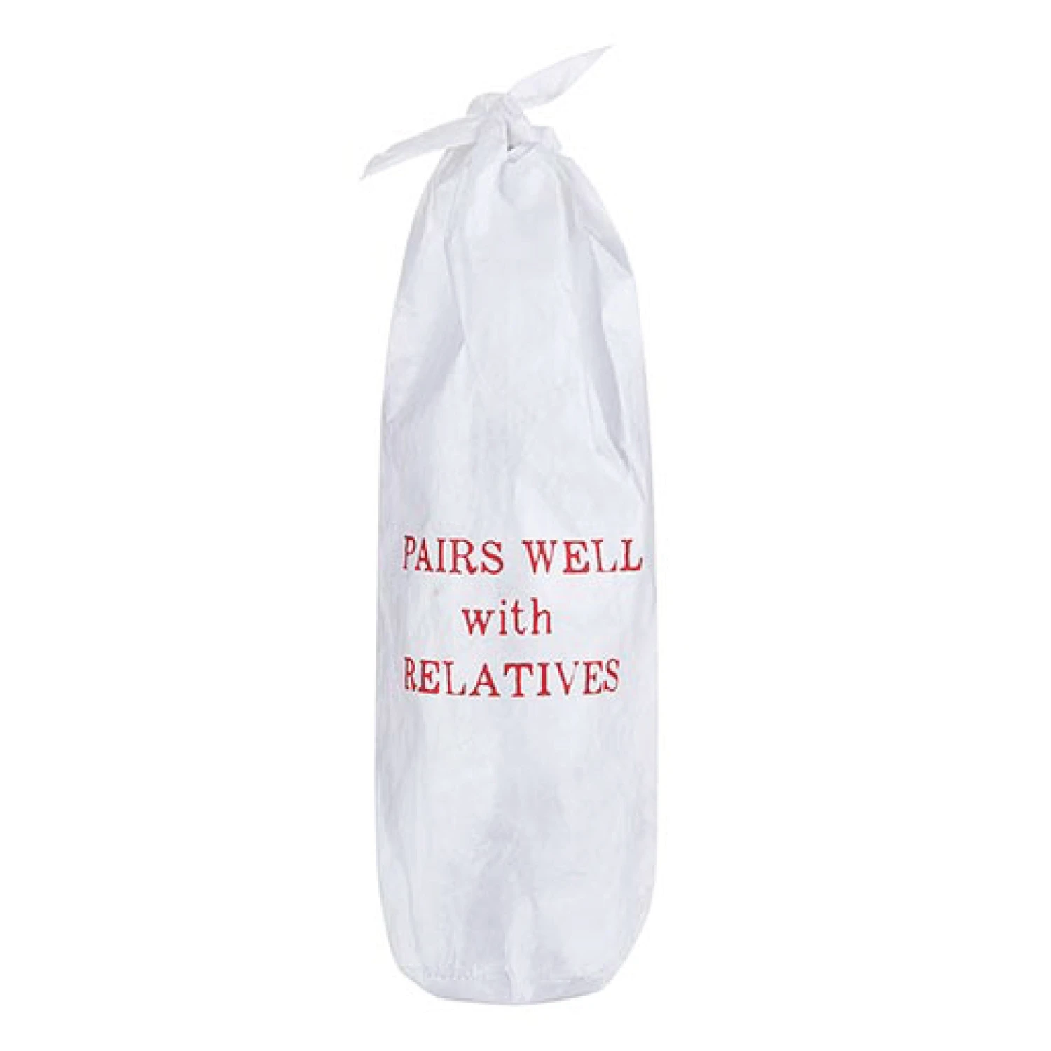 Give your friends the perfect gift to get through the holidays when you fill this Pairs Well with Relatives Tyvek Wine Bottle Bag. This Tyvek wine bag features the headline “Pairs Well with Relatives” in red on a white background. This wine bag ties together at the top to hold the perfect bottle. Give an intoxicating gift for the hostess, a friend’s birthday, or to say thank you. Put a bottle of bubbly or wine in this gift bag for a quick and easy gift that’s sure to please.
