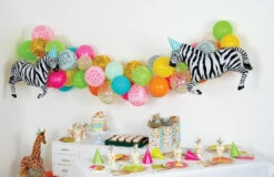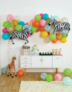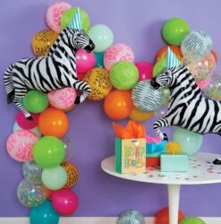 Get ready to turn your safari party space into a wild adventure with this Party Animals Birthday Balloon Garland Kit! With various colorful latex balloons featuring zoo animal prints and two giant zebra balloons, you’ll transform your home into a whimsical animal kingdom. Inflate those balloons with the included straw, assemble them to the hanging strip, and create a mesmerizing garland that will have your guests roaring with excitement. Hang it along the wall, across doorways, above the party table, or as a backdrop for a photo booth to capture all the safari-themed memories. This safari balloon arch will be the mane attraction for your child’s wild one birthday, jungle birthday, or zoo birthday bash!