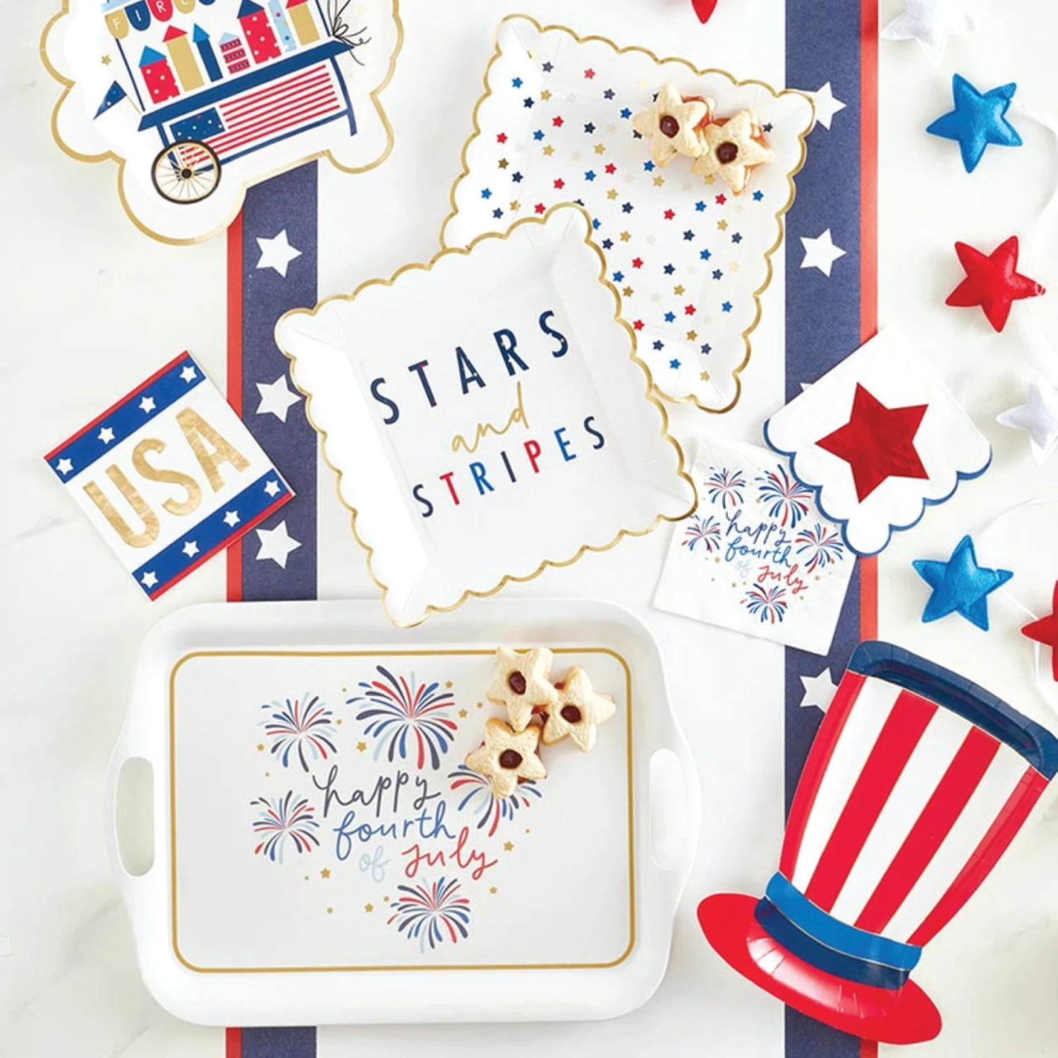 Serve up some patriotic fun with these Patriotic Uncle Sam Hat Shaped Lunch Plates! These large paper die-cut plates resemble the classic American top hat enhanced with elegant gold foil accents. Perfect for backyard barbecues and Fourth of July parties, these plates add a touch of patriotic fun to any gathering. Serve your favorite summertime dishes like burgers, hot dogs, or a delicious pasta salad on these 4th of July plates. So whether you’re celebrating at a Fourth of July bash, Memorial Day pool party, or your little firecracker’s birthday, these patriotic plates will add a touch of patriotic flair to your celebration. Complete your festive holiday gathering with our other patriotic party supplies!
