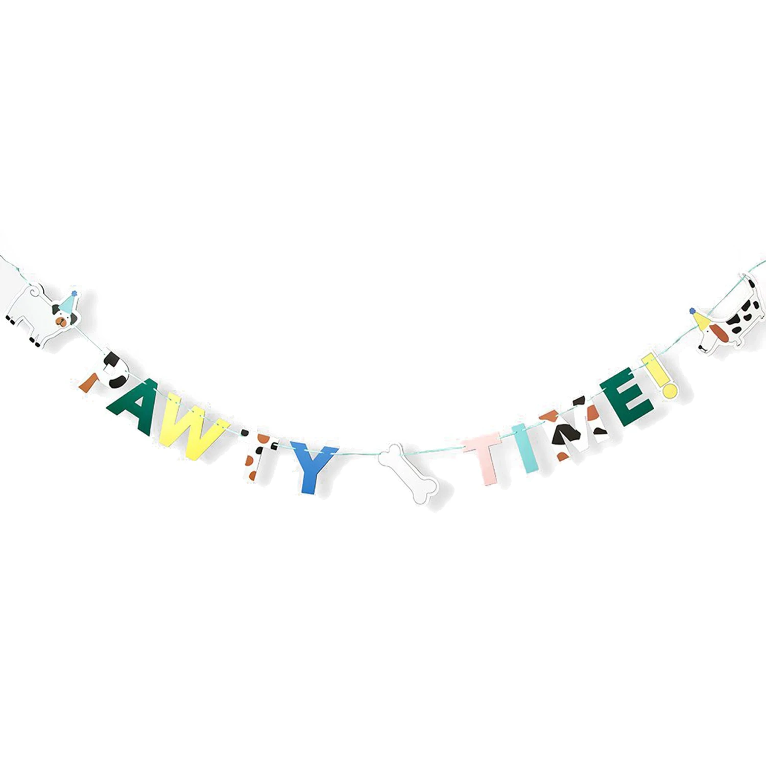 Your little pups will bark with joy when they see a cute Pawty Time Dog Banner hanging on the wall. This letter banner features cardstock letter cutouts that spell out “Pawty Time!” with a white bone separating the two words and a cute and cuddly puppy on each end. Easily hang this dog-themed decoration on the wall with the included string. Bring the fun (and the pun) wherever this party garland is placed at your child’s first birthday party or your puppy baby shower