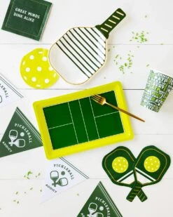 Serve up some fun on and off the court with these Pickleball Court Lunch Plates! Shaped like a miniature pickleball court, complete with lime green out-of-bounds areas, a dark green play zone, and white and gold foil boundary lines, these pickleball plates bring the excitement of the game to your table. Ideal for serving lunch, appetizers, or desserts, these disposable plates ensure that cleanup is as easy as scoring a point. Whether hosting a pickleball birthday party or celebrating with players and fans, these paper plates are the perfect match for your pickleball party decor.Â