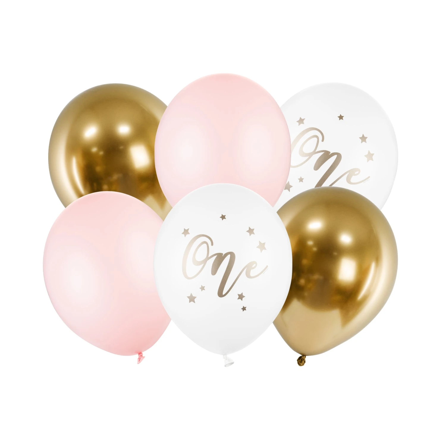 Celebrate your little girl’s first birthday in style with this 6 piece Pink & Gold 1st Birthday Balloon Bouquet. This bouquet includes latex balloons in pale pink, glossy gold, and white with gold print in stars and the word “One”. This balloon bouquet will add that special touch of magic to your little girl’s first birthday party. Mix with the pink number “1” balloon to create a beautiful arrangement at the party entrance to welcome guests.