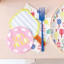 Let’s dink and wipe away the competition with these Pink & Green Let’s Pickle Pickleball Dessert Napkins! These small paper napkins are designed to resemble pink and green pickleballs, complete with distinctive white holes and an all-caps “Let’s Pickle” headline. Perfect for keeping hands clean and ready to ace those small spills, these pickleball napkins are a must-have for any pickleball party celebration. Whether hosting a pickleball birthday party or post-game brunch, these disposable napkins will be a winning combination on and off the court!