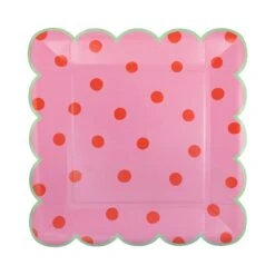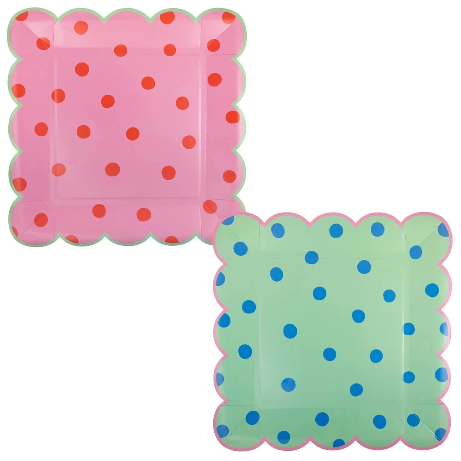 Brighten up your celebration with this Pink & Green Polka Dot Dinner Plate Set! This delightful set features two eye-catching designs: a pink plate with red polka dots and a green scalloped border, and a green plate with blue polka dots and a vibrant pink border. Crafted from sturdy paper, these plates are as functional as they are fun, making cleanup quick and easy. Perfect for any party, these colorful plates bring a lively and cheerful vibe to your table. Say hello to bold, festive flair at your next event!
