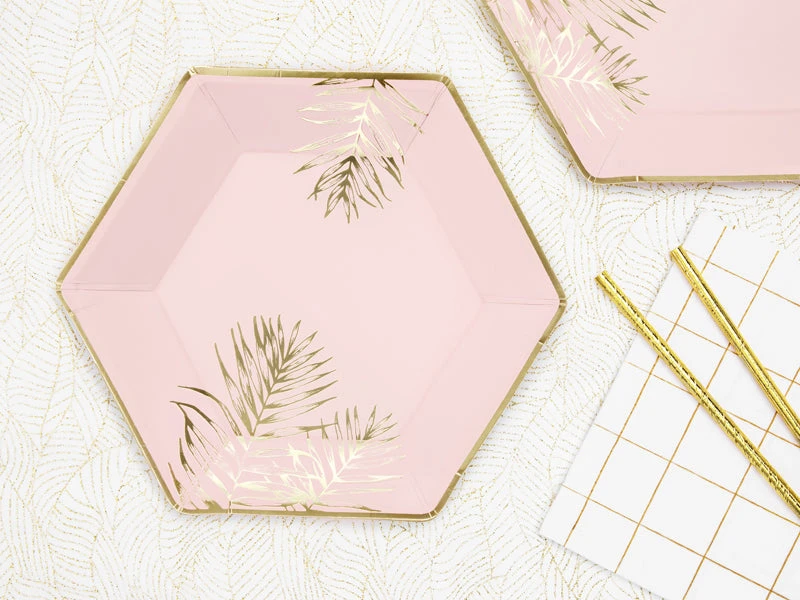 Add a touch of elegant shine to your party tables with these Pink Tropical Lunch Plates. These large hexagon-shaped plates feature gold palm leaves against a light pink background with gold around the edge. These plates will add a touch of tropical cuteness to your tropical bachelorette party or tropical baby shower. Serve tea sandwiches, finger foods, or salads on these elegant wedding plates during a bridal shower brunch or engagement party.