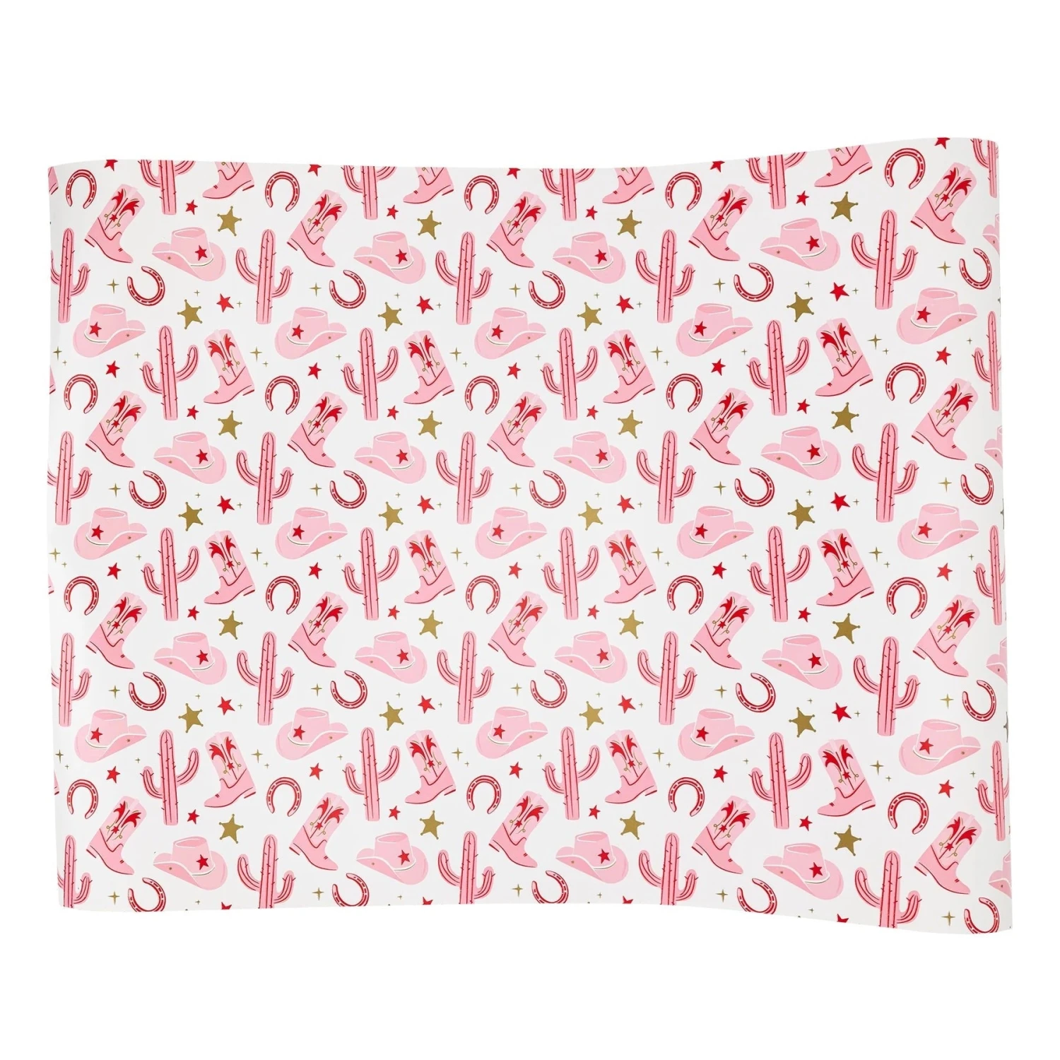 Saddle up, cowgirls, and line your cowgirl party table with this Pink Western Cowgirl Paper Table Runner. Made of durable yet lightweight paper, this table runner is adorned with gold foil stars, surrounded by pink cowgirl hats, boots, horseshoes, and cacti illustrations, all set against a creamy background. With enough length to cover up to a 10ft table, cut this runner to size and lay it down the center for a pink western party centerpiece. Whether hosting a cowgirl birthday bash, a bride’s last rodeo bachelorette party, or any disco cowgirl hoedown, this table runner is sure to lasso in fun and set the stage for a wild time!