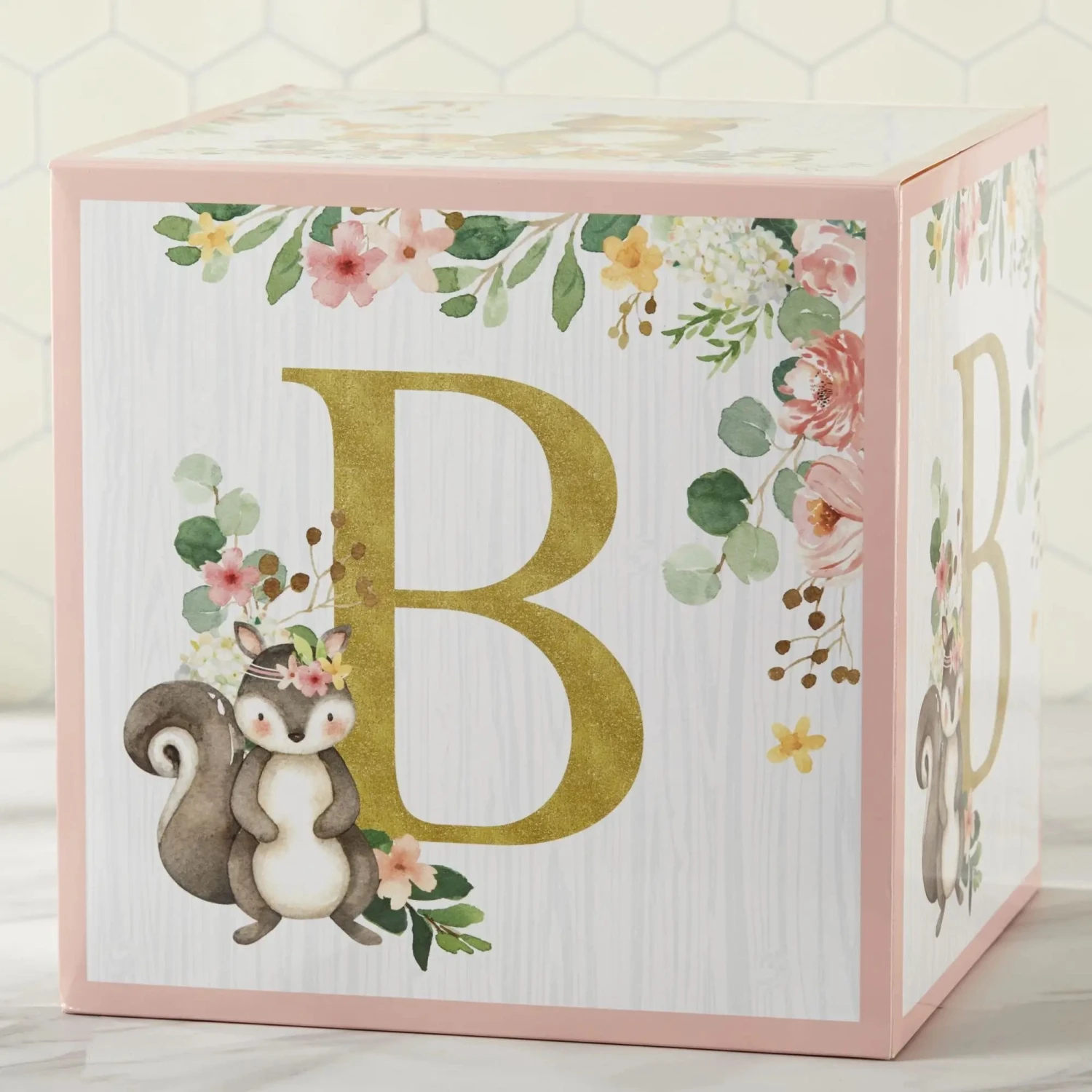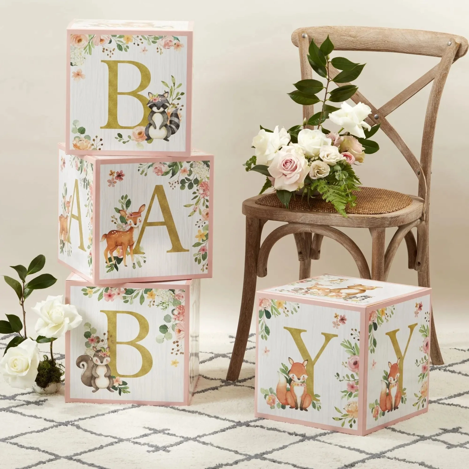 Add an adorable touch to your baby shower backdrop with these Pink Woodland Baby Block Decorations. These four paper boxes feature pink borders, woodland forest animals, and a glittery gold printed letter in the middle. After assembling each box, stack them together to create a four-foot-tall tower that reads “BABY.” Use these block letters as photo booth props to create the perfect photo-op with the mommy-to-be. Place this baby block sign by the cake table or any open area where the guests could pose next to the mom-to-be.