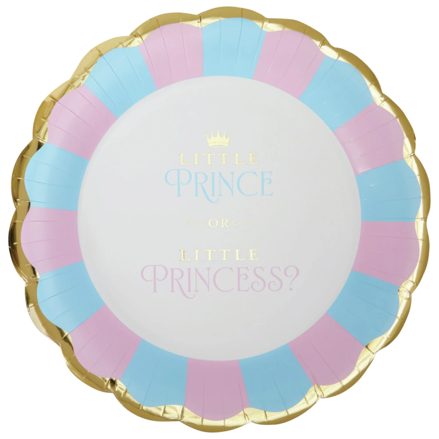 Let the royal reveal begin with these Prince or Princess Dinner Plates! These elegant paper plates feature a gold foil scalloped edge with an alternating pink and blue design, crowned with a gold foil crown and a “Little Prince or Little Princess” headline. Sturdy and stylish, these gender reveal plates are the perfect base for sweet treats and snacks as guests await the big news. Perfect for the mom-to-be’s big announcement, these plates add a royal touch to any gender reveal party fit for a future prince or princess!