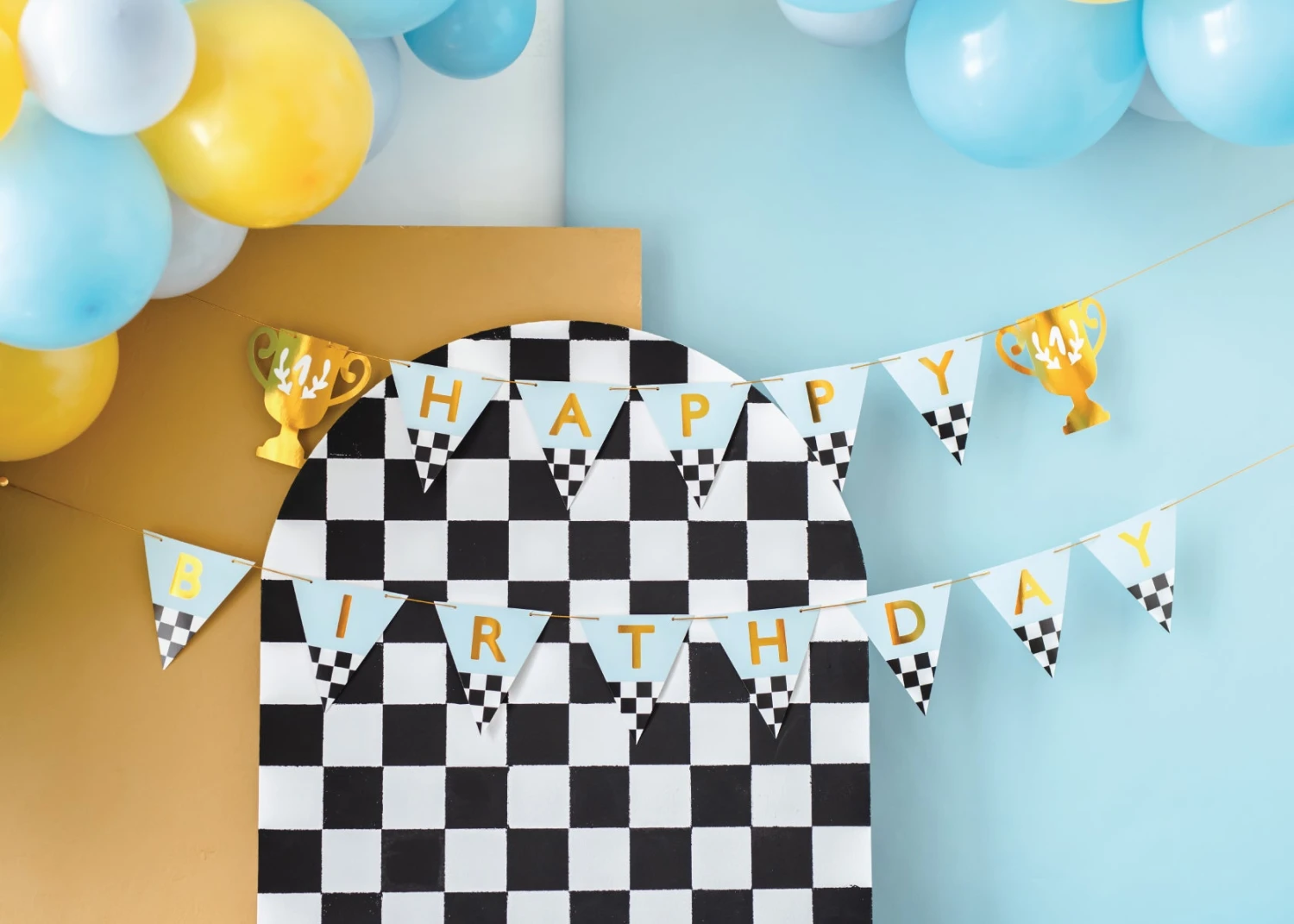 Rev up the birthday excitement with a Racing Trophy Happy Birthday Pennant Banner! This DIY racing banner is a winning addition to a race car birthday party, showcasing two gold trophy cutouts and thirteen pennant flags in light blue with a black and white checkered flag pattern adorned with a gold letter that spells out “Happy Birthday.” Assemble the banner using the included twine, and you’re ready to hang it on walls, tables, or as a backdrop for memorable photos. Whether celebrating a fast one, two fast, or any little racer’s age, this race car birthday decoration sets the pace for a high-speed celebration!