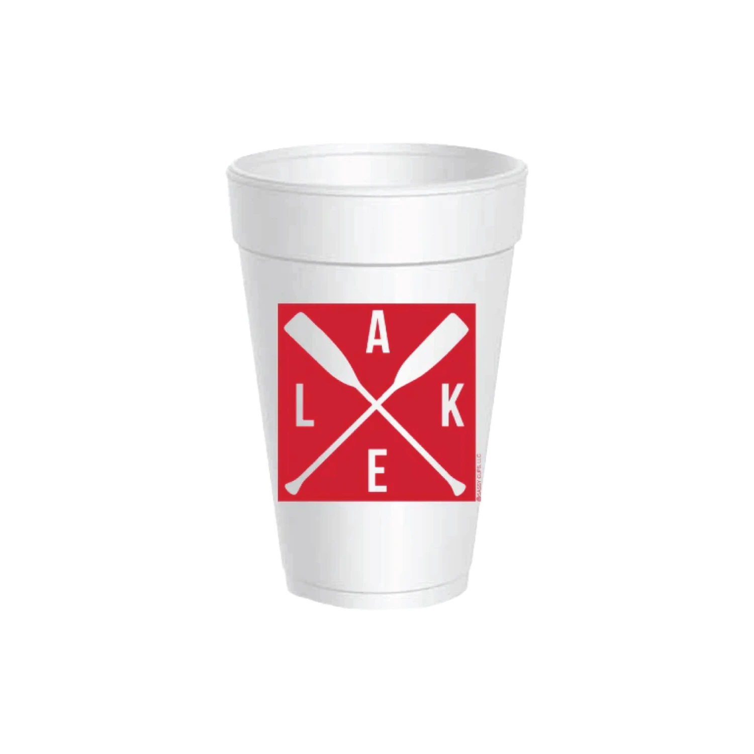 Welcome guests to your lake house with a cold beverage in these Red Lake Paddles Styrofoam Cups with Lids! These white styrofoam cups feature a red square with crossed oars and a “LAKE” headline. Guests can use these shatterproof cups and plastic lids to sip lemonade, tea, mixed drinks, or any hot or cold beverages during their day on the lake. Then, take their cups home with them as fun nautical party favors! Keep a stack of these lake house cups at your summer pool party, or use them for your last splash bachelorette party.