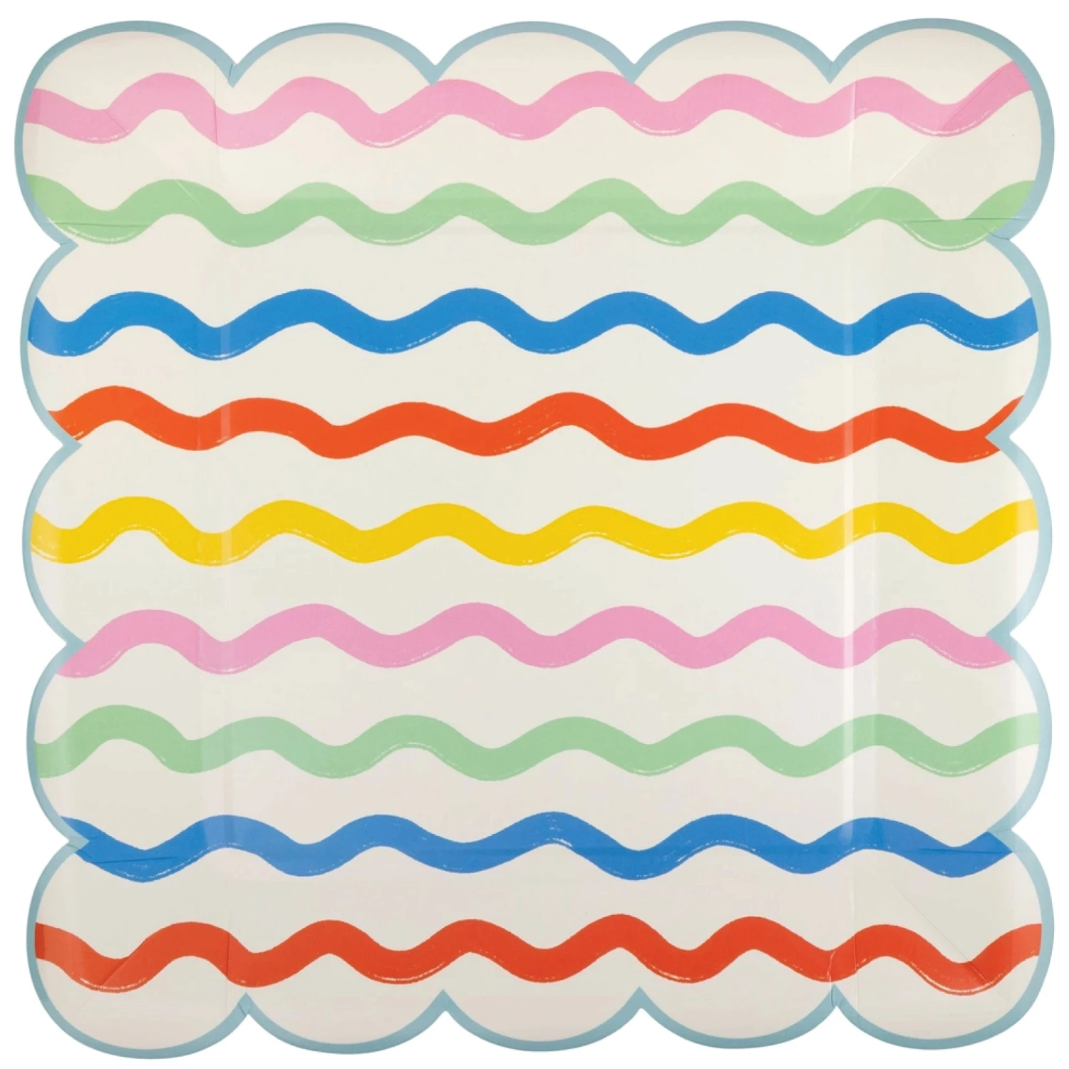 Add some colorful flair to your dinner party with these Ric Rac Square Dinner Plates! These square paper plates feature a ric rac horizontal stripe pattern in colors of blue, yellow, red, green and pink on a white background with a light blue scalloped trim. This festive and colorful are sure to bring a smile to your face. Perfect for any occasion, these plates are both functional and stylish.