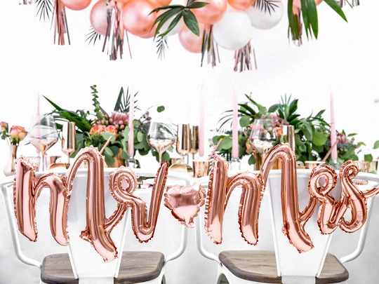 Add some rose gold flair to your engagement party decorations with this Rose Gold Mr. & Mrs. Cursive Letter Balloon Banner! This rose gold foil balloon banner inflates to read “Mrs & Mrs” in a fun cursive font with a heart in the middle. Mix and match it with other rose gold letters or number balloons to create any message you want! Tape this letter balloon banner to the wall or use it as a unique photo prop at your wedding or bridal shower.