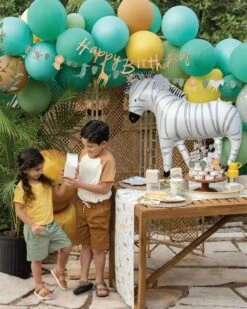 Bring out the wild side and celebrate the big day with this Safari Happy Birthday Banner Set! The letter banner boasts cheetah print letters spelling out “Happy Birthday,” accented with a touch of gold foil for a dash of elegance. The second banner steals the show with playful paper cutouts featuring jungle foliage and a lively cast of safari animals, including zebras, lions, giraffes, elephants, monkeys, and crocodiles. Hang these pre-sewn banners high to create a photo backdrop for your little explorers, turning your safari birthday party into an unforgettable adventure for your wild one.