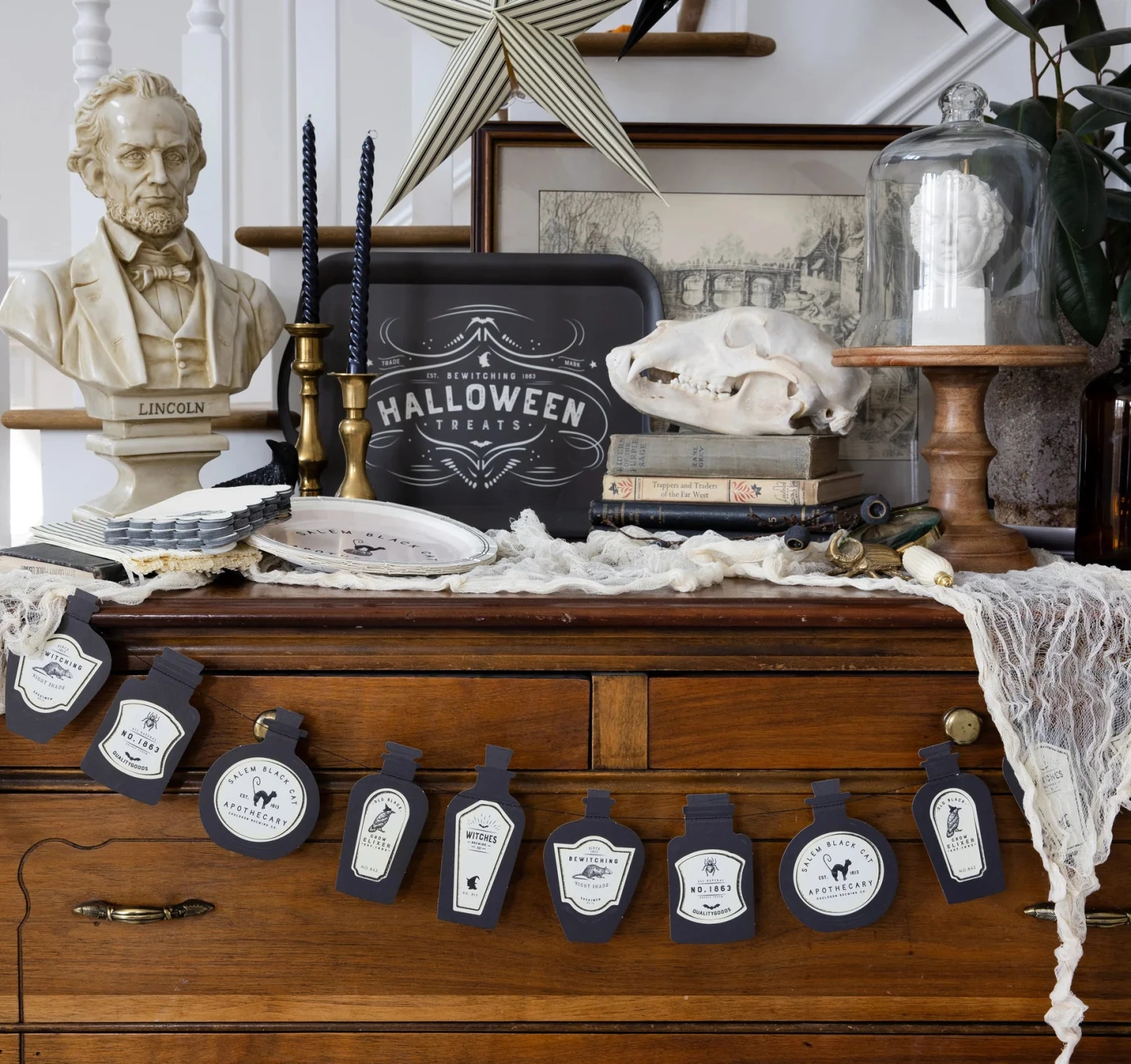 Bewitch trick-or-treaters when you serve them witches brew on this Salem Apothecary Halloween Bamboo Serving Tray. This black bamboo platter features a vintage apothecary design with a white “Bewitching Halloween Treats” headline and lifted edges to keep food in place. The handles on each end make it easy to carry around Halloween candy, snacks, or drinks with a mystical twist. The bamboo construction is eco-friendly and durable, so pop it in the dishwasher and reuse it every Halloween. Whether you’re hosting a Hocus Pocus party or a child’s spooktacular Halloween birthday, this Halloween tray is the perfect centerpiece to display your haunted potions and spellbinding delights!