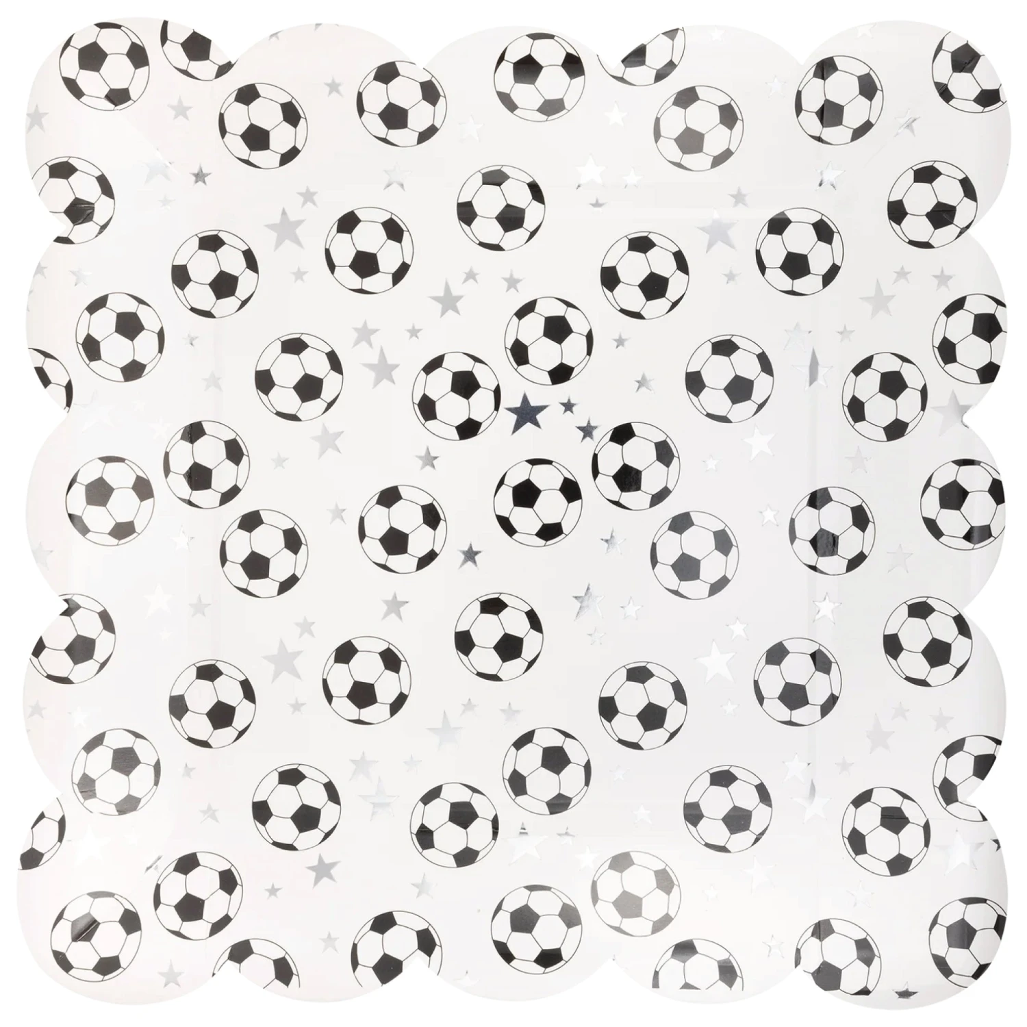 Score a goal at your next soccer bash with Scattered Soccer Balls Lunch Plates! These square paper plates are a winning choice, sporting a scalloped edge with scattered soccer balls and sparkling silver foil stars against a white background. Perfect for fueling up with snacks while cheering on your favorite team, these disposable plates make cleanup a breeze so you can focus on the game. Whether you’re hosting a soccer birthday party or a World Cup watch party, these soccer plates will surely kick it up a notch!