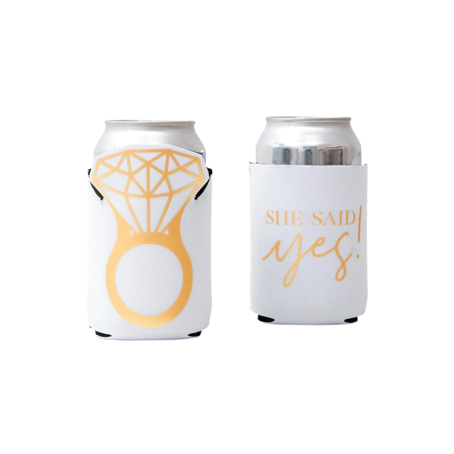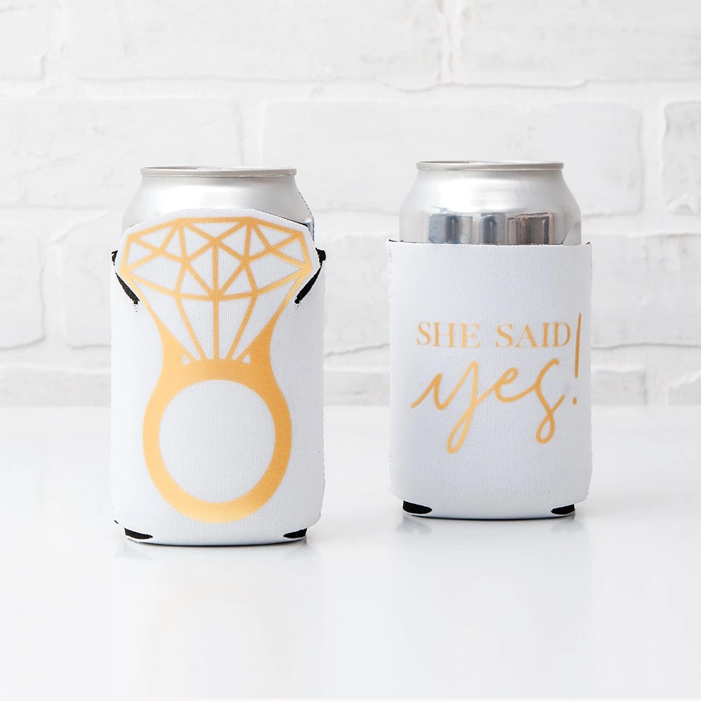 Keep drinks ice cold at her last fling before the ring with this She Said Yes Can Coozie. This can cooler is white with a gold diamond ring on one side and a headline that reads “She Said Yes” on the other side. Use this drink holder to ensure your beer or soda cans and bottles stay cool during your bachelorette party. Give this coozie as a bridesmaid party favor or engagement party gift.
