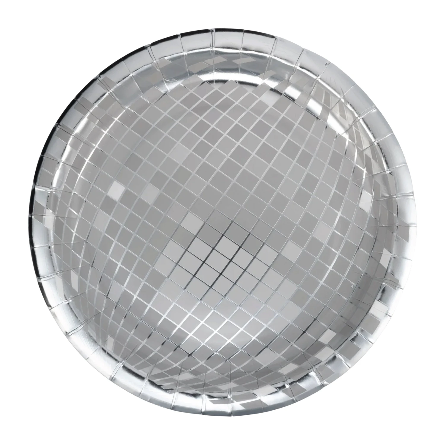 Sparkle, shine, and dine with these Silver Disco Ball Lunch Plates! These paper plates are designed to look like disco balls, complete with a dazzling silver foil finish that catches the light just right. Perfect for serving snazzy bites while making cleanup a breeze, these disco ball plates bring the party vibes to any glamorous gathering. Ideal for a New Year’s Eve party, a disco bachelorette, or any disco-themed celebration, keep the fun spinning all night long with these disco party plates!