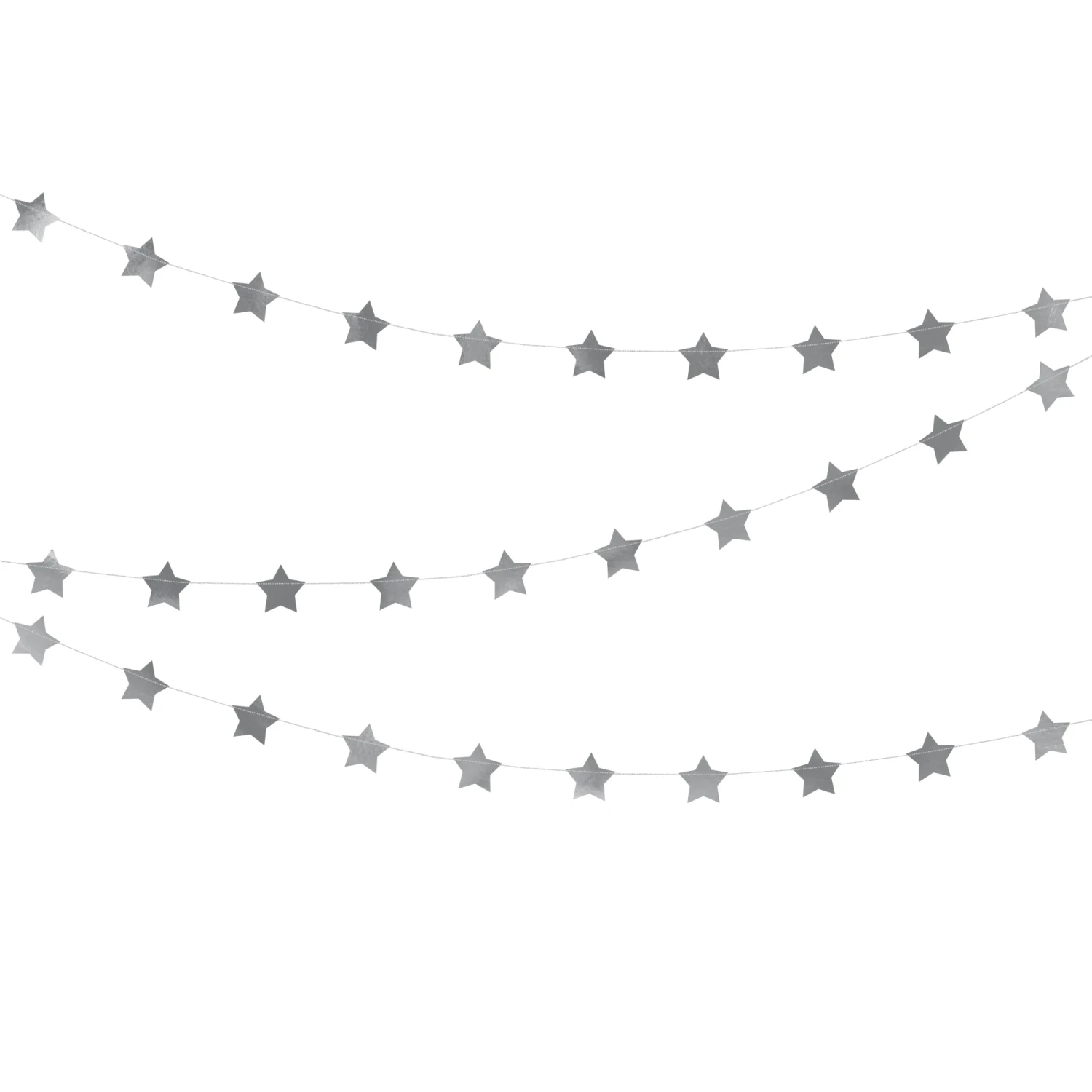 Add some sparkle and shine to your next party with this Silver Star Garland. This metallic silver star banner is pre-stitched and ready to hang. Just add with party fans and other banners to create the perfect party backdrop.