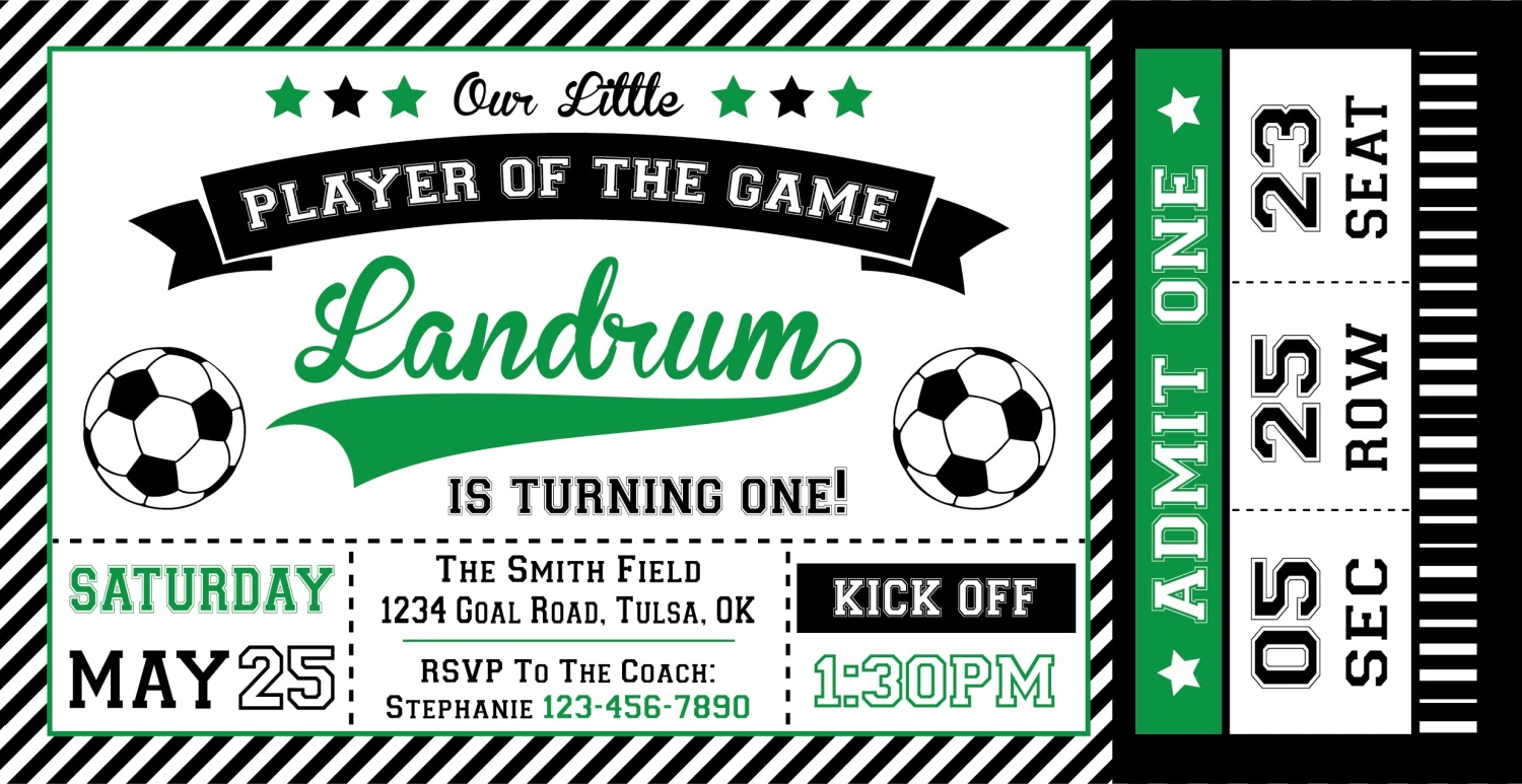 Invite their biggest fans to celebrate your little soccer player’s birthday with this printable Soccer Ticket Birthday Party Invitation! This two-sided digital invitation looks like an actual soccer ticket with all the crucial details about the celebration, such as the date, time, and location. The headline “Our little player of the game” is written across the top, with the birthday boy or girl’s name in the middle, where we can customize it to your child’s name and age. The back of the invitation has a horizontal black-and-white pattern. Our invitations are designed to be easily printed at home or at your local print shop so that you can get them in your guests’ hands quickly and easily. Plus, with the ability to print as many as you need, you can invite all of your little all-stars’ friends and family without worrying about running out. So send this soccer invitation to your guests so they can celebrate at your sports birthday party!
