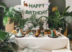 Channel your inner prehistoric party animal with these Spiked Dinosaur Party Hats! These DIY paper hats come in dark green, mint, and brown colors. To assemble the hats, make the cone shape, slide the paper spike into the pre-cut slot, and slip the elastic through the holes on each side. Perfect for little dinos, mamasaurus, and daddysaurus to wear, these dinosaur hats are sure to be a roaring hit at a dinosaur birthday party.