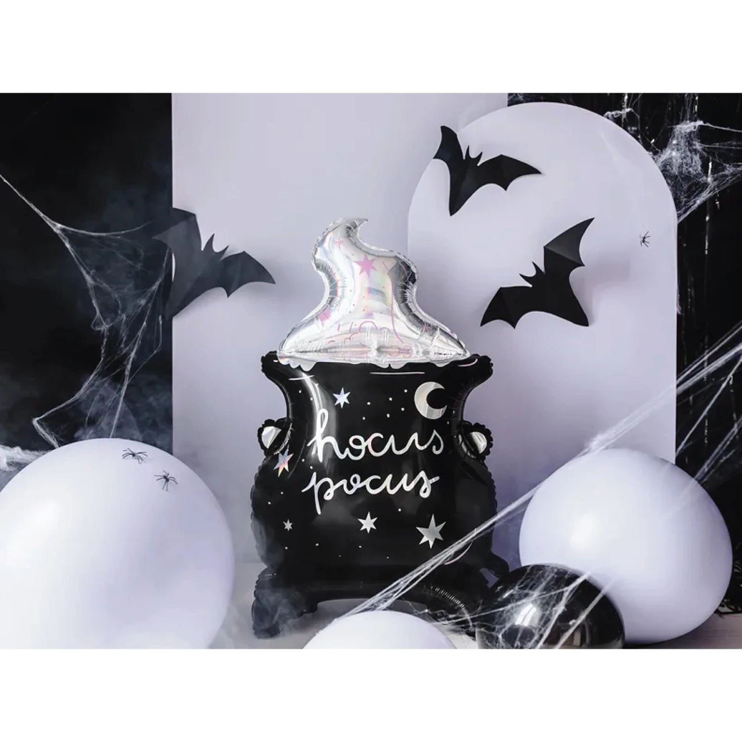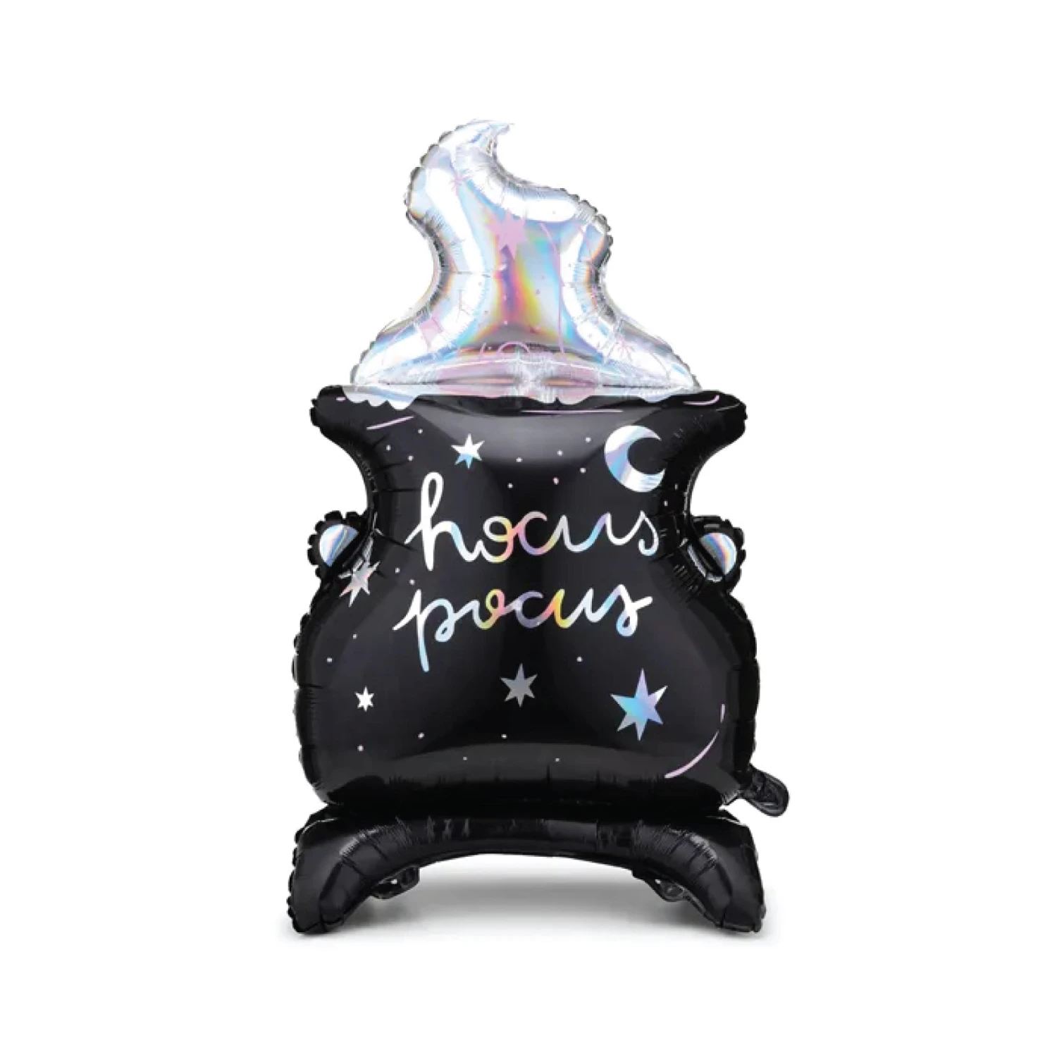 Brew something for your little witches and wizards with this Standing Hocus Pocus Cauldron Balloon. This free-standing foil balloon looks like a black cauldron with scattered holographic crescent moon and stars, a potion brewing, and a “Hocus Pocus” script headline. Inflate the witch balloon using the included straw—no helium required. Let this air-filled cauldron balloon cook up a magical atmosphere at your Hocus Pocus party or kid’s Halloween birthday party!