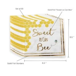All the buzz at your baby shower will be around your table set with these bee-utiful Sweet As Can Bee Lunch Napkins. The front of the napkins features the wording “Sweet as Can Bee” in gold foil, with two outer gold foil borders, yellow honeycombs, and a cute little bee. These paper napkins are the perfect addition to the table spread at your gender reveal party or baby shower.
